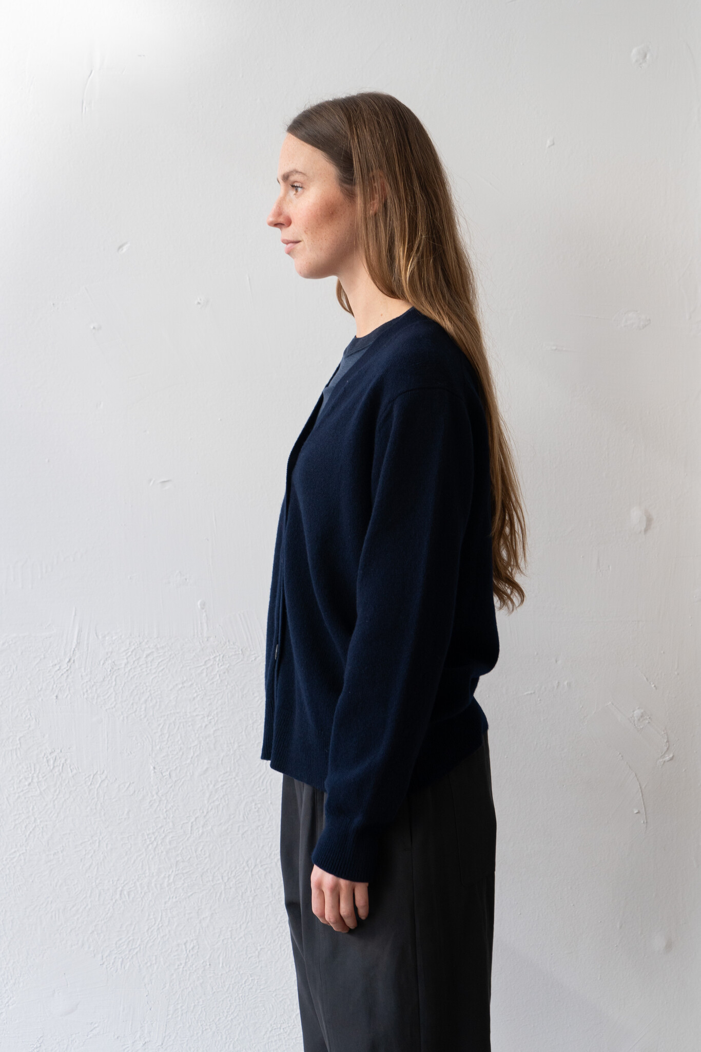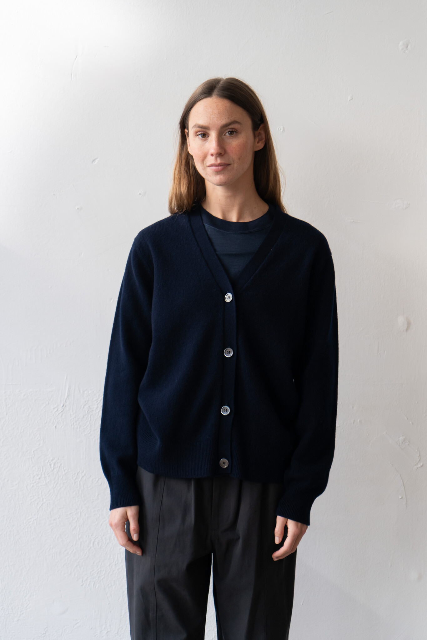 The Ava Cardigan by &Daughter in Dark Navy, knit in super soft, Scottish-spun Geelong lambswool. Its silhouette is neither slim, nor oversized, a subtle slouch for ease of layering throughout the cooler months and an elegant drape.