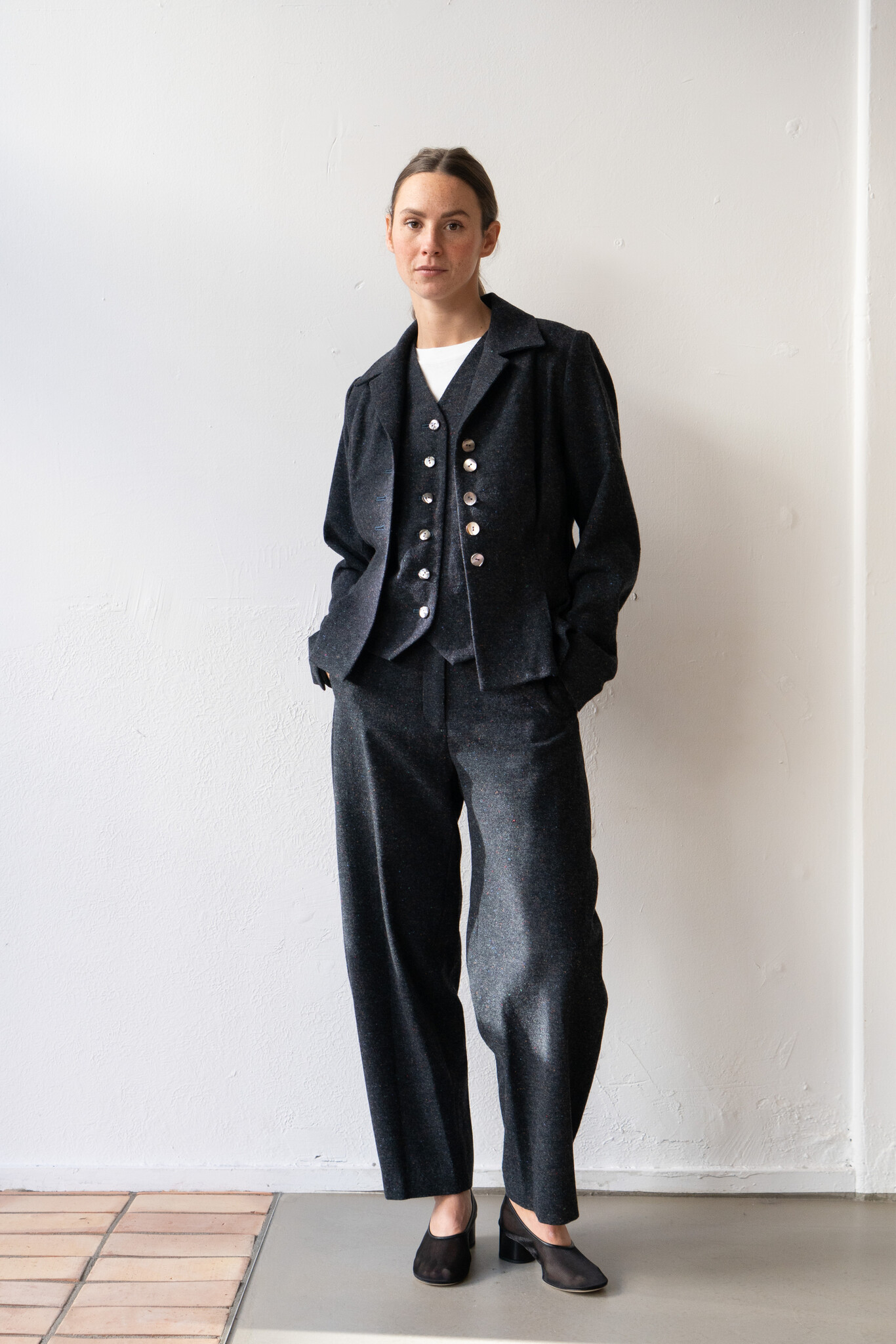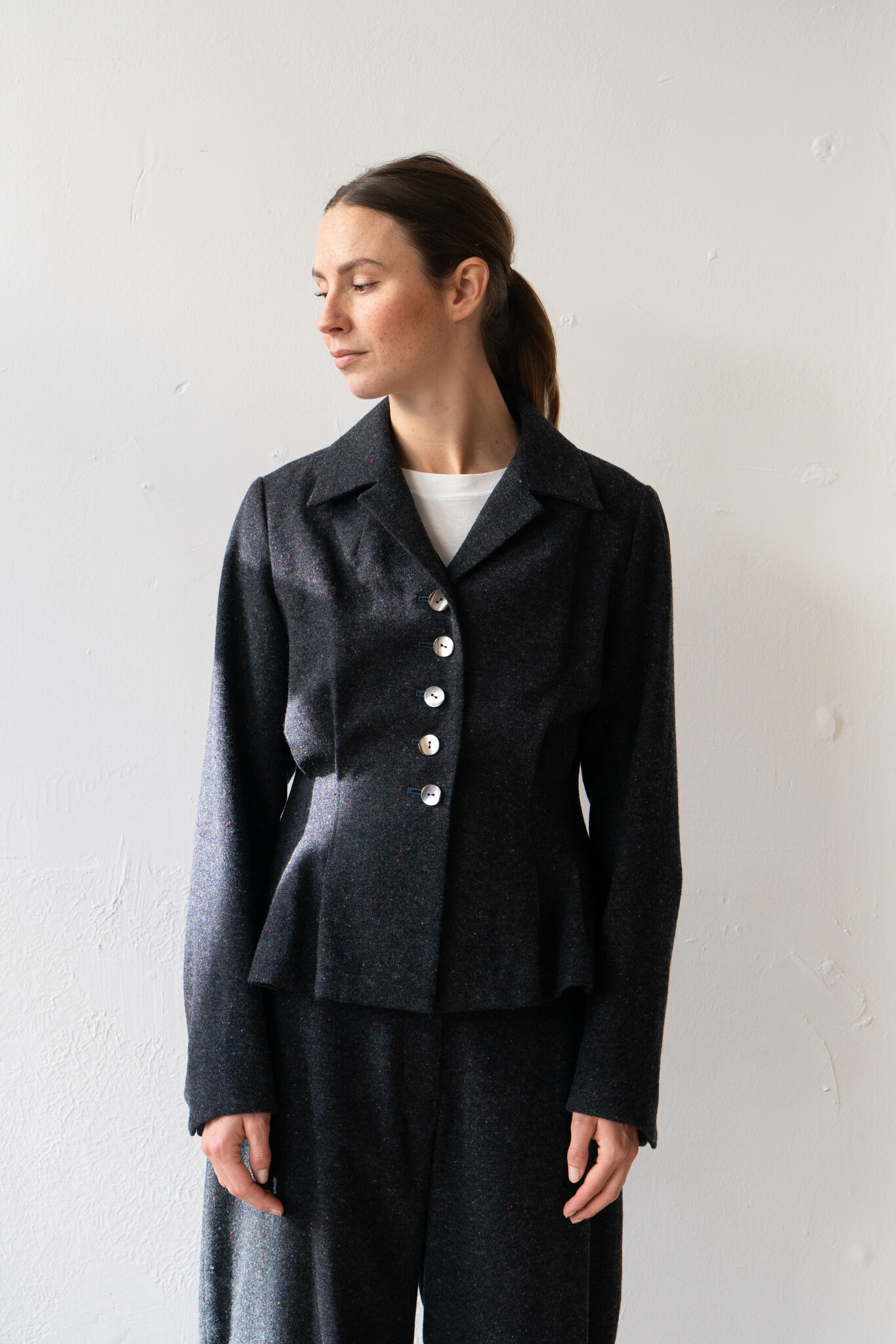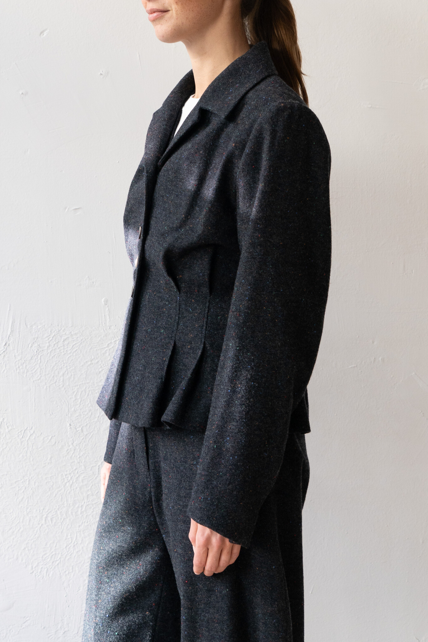 Classic and full of charm, this vest from Ernie Palo is a timeless staple. Made of wool, the surface is flecked with multicoloured neps that give a subtle touch of play to its grey/blue base. It has a refined silhouette that sits neatly on the shoulders with darting at the waist and a subtle peplum shape through the body. Easy to style across seasons, it can be worn over a t-shirt or layered over with shirting. Complete with a V-neckline, a notched collar, and iridescent buttons, this jacket is classic yet far from boring.