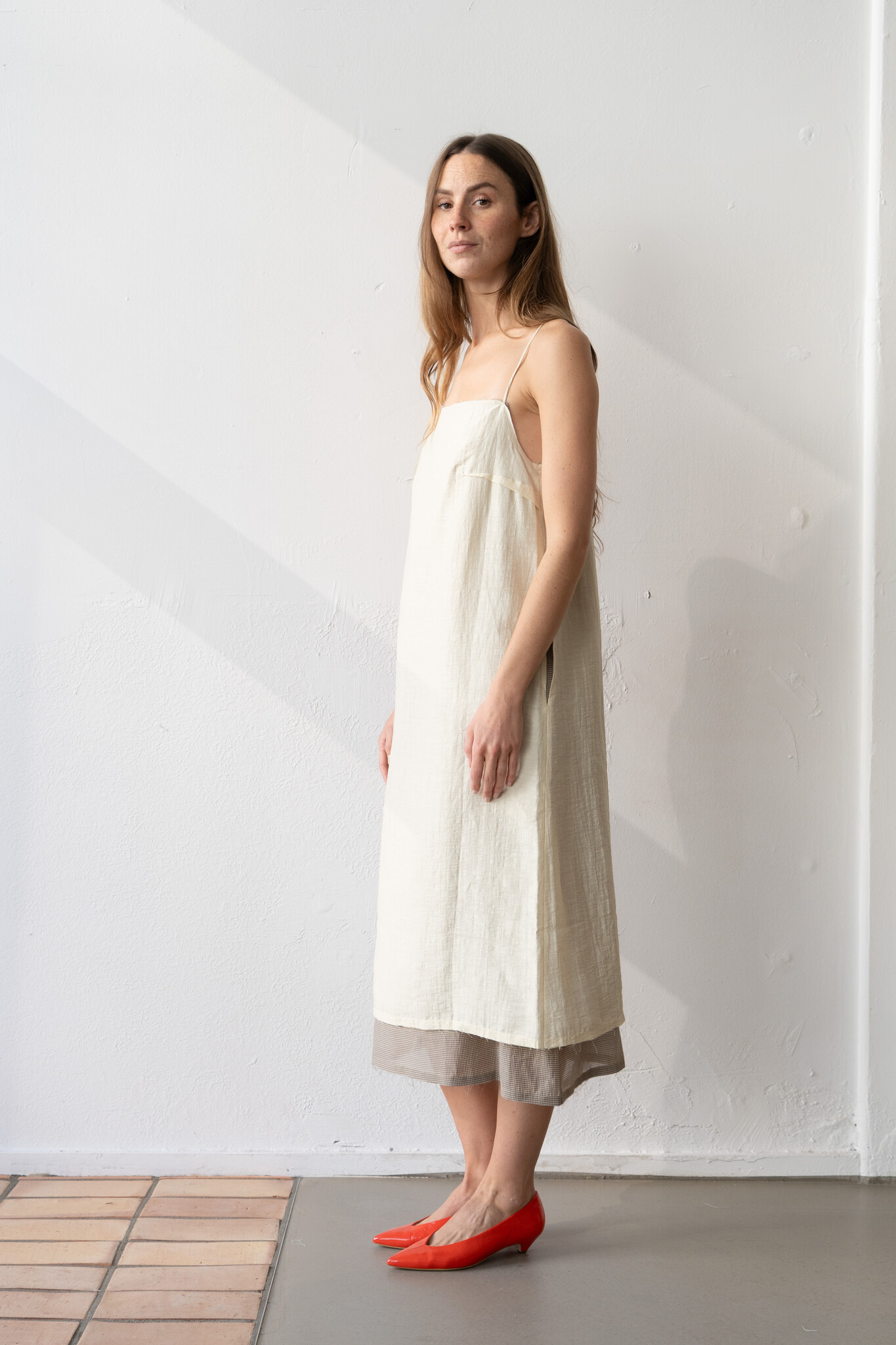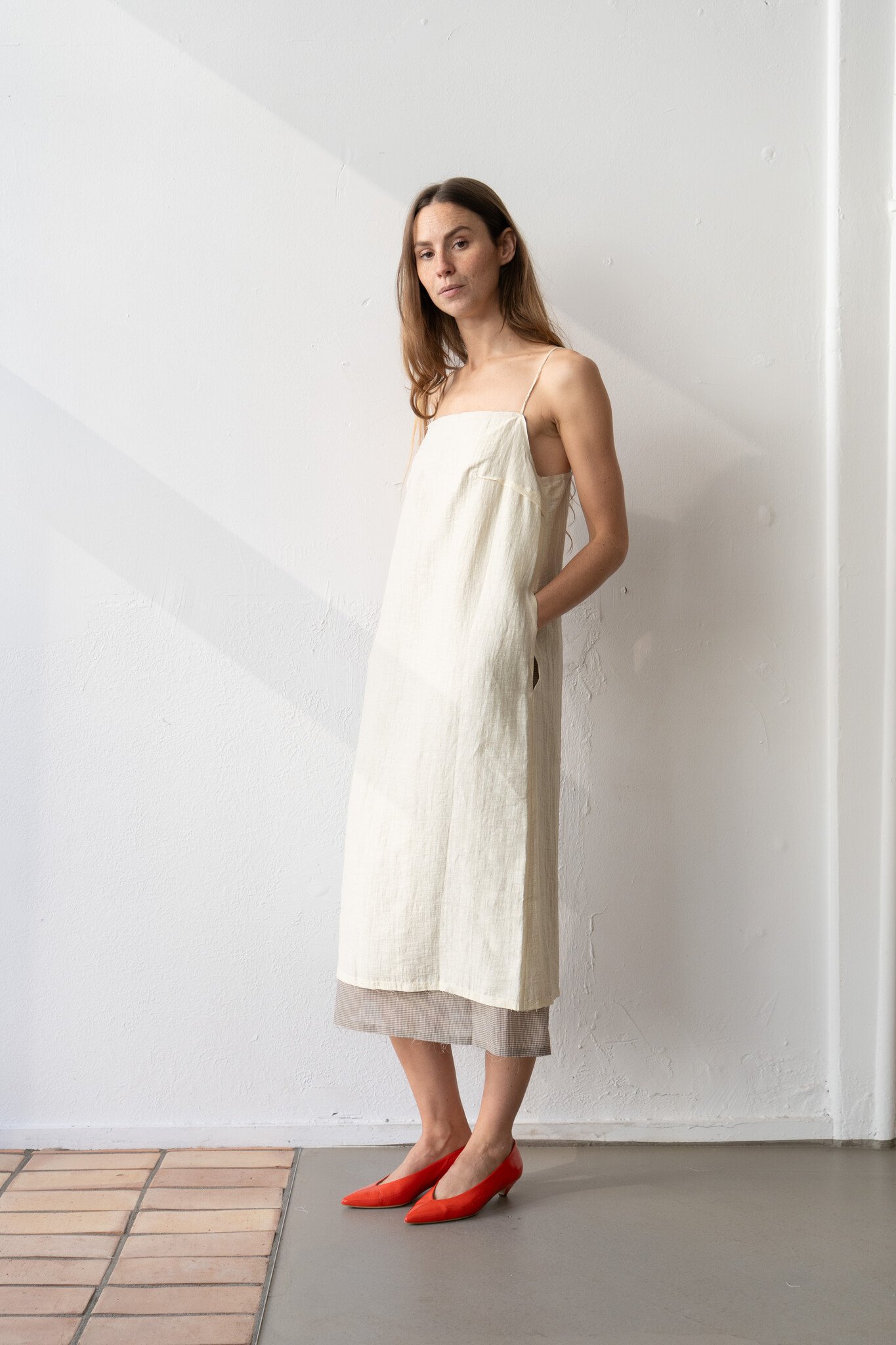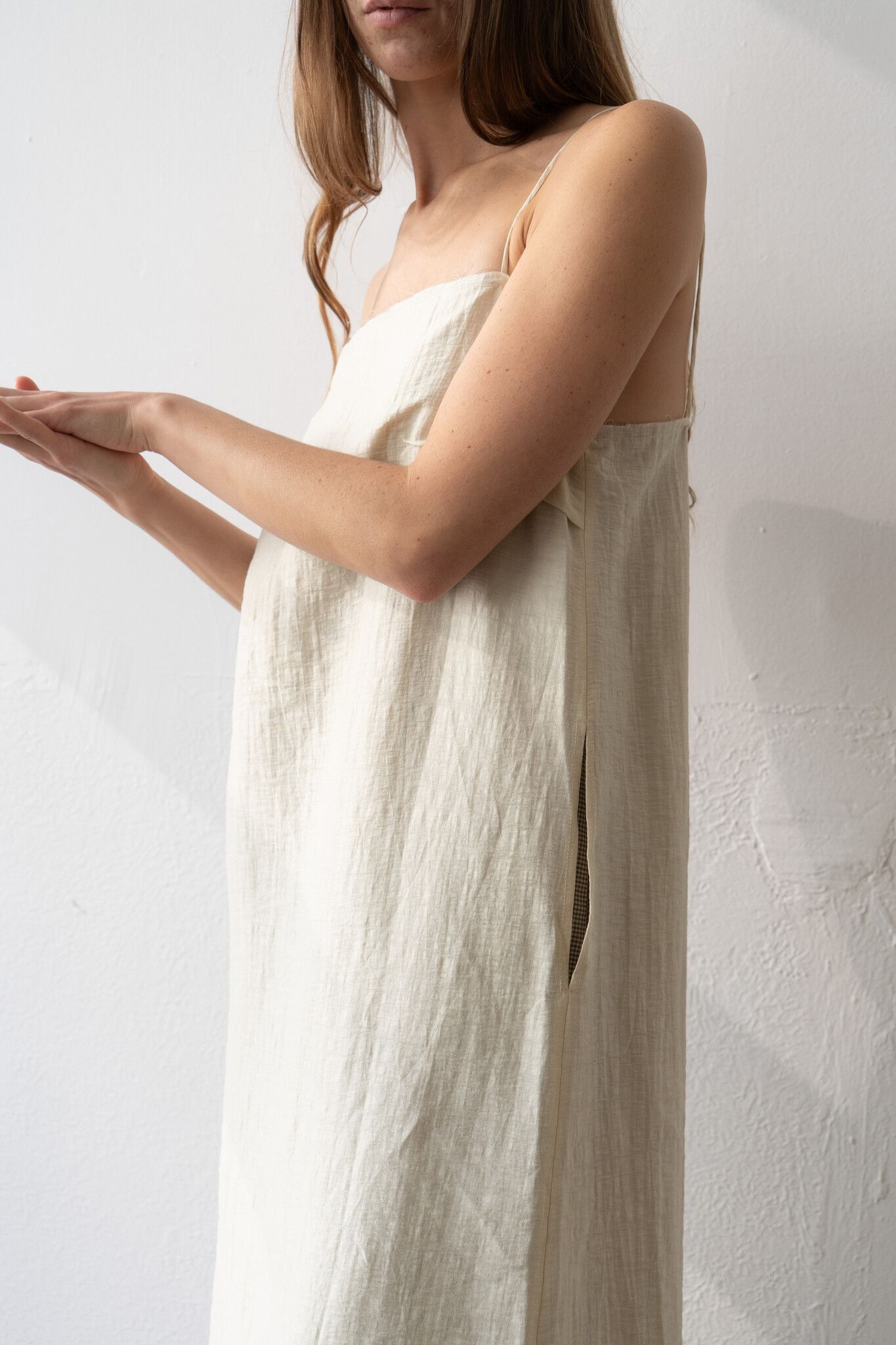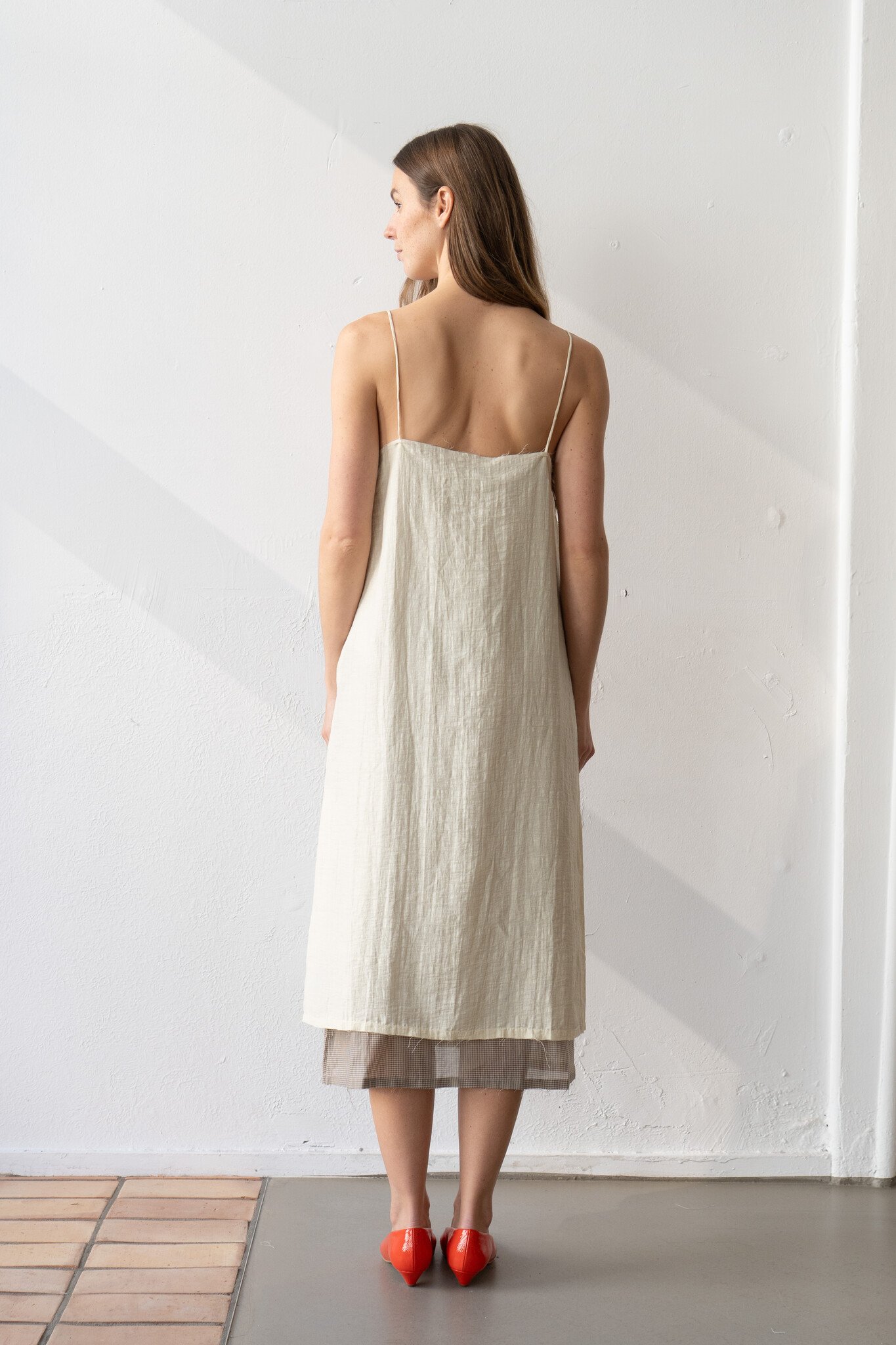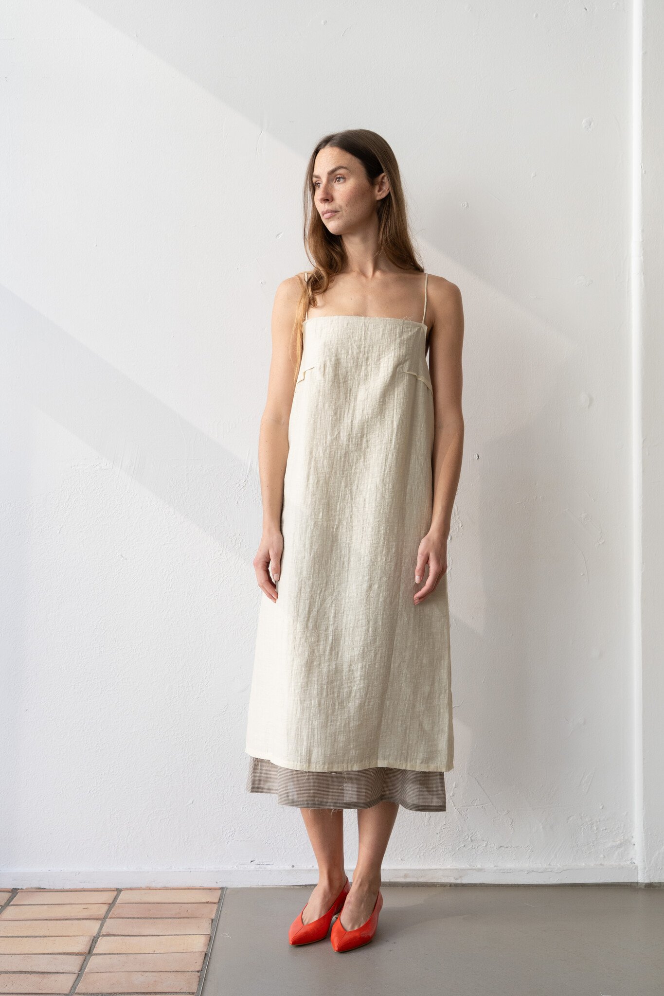 Layered midi dress by RUS crafted from textured linen, paired with a cotton silk inner layer. Features a straight neckline, spaghetti straps, side pockets, frayed edges at the neckline and hem, and exposed darts. The outer layer sits slightly shorter than the inner layer, creating a layered effect. Perfect for layering or wearing alone.