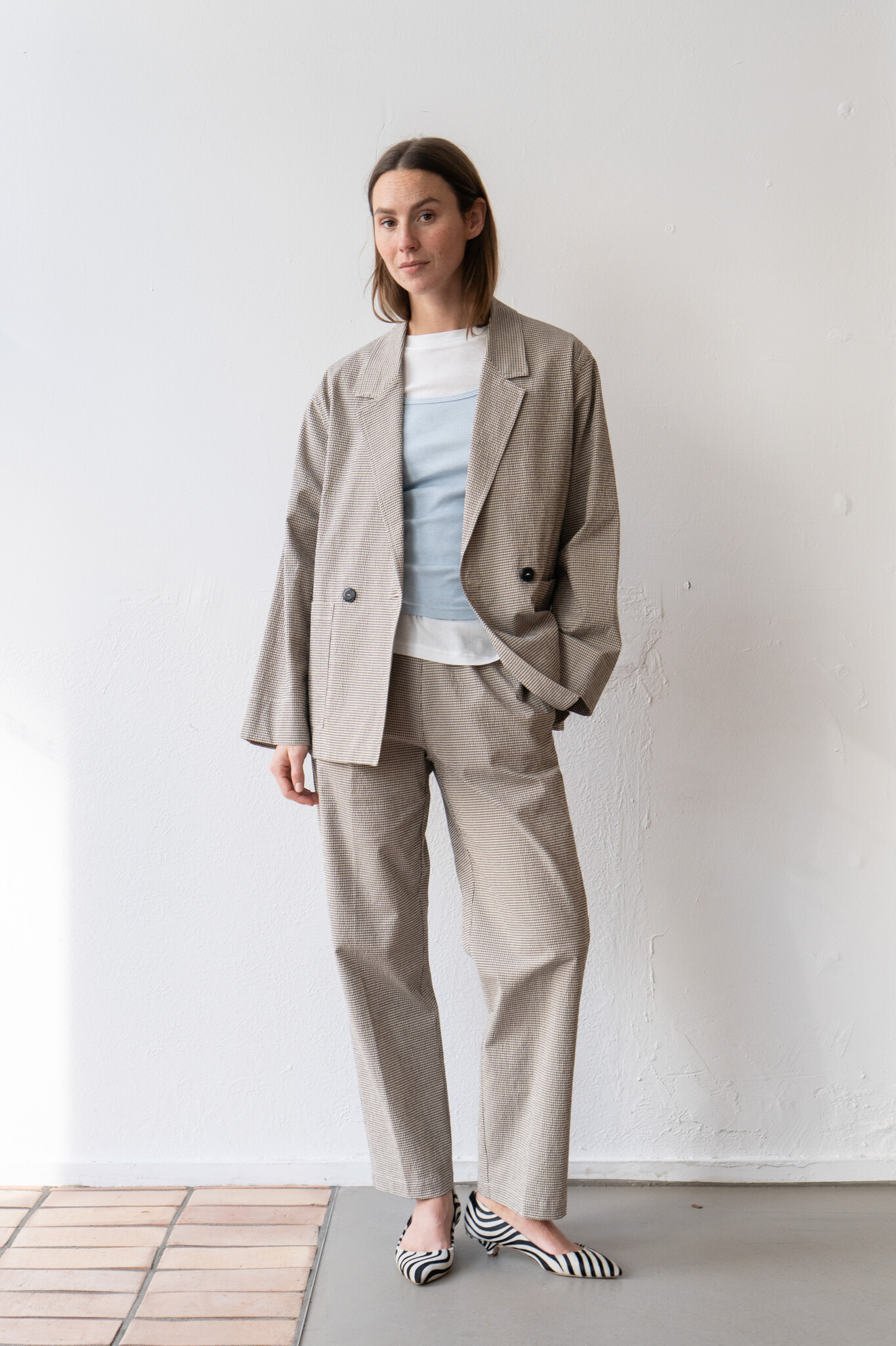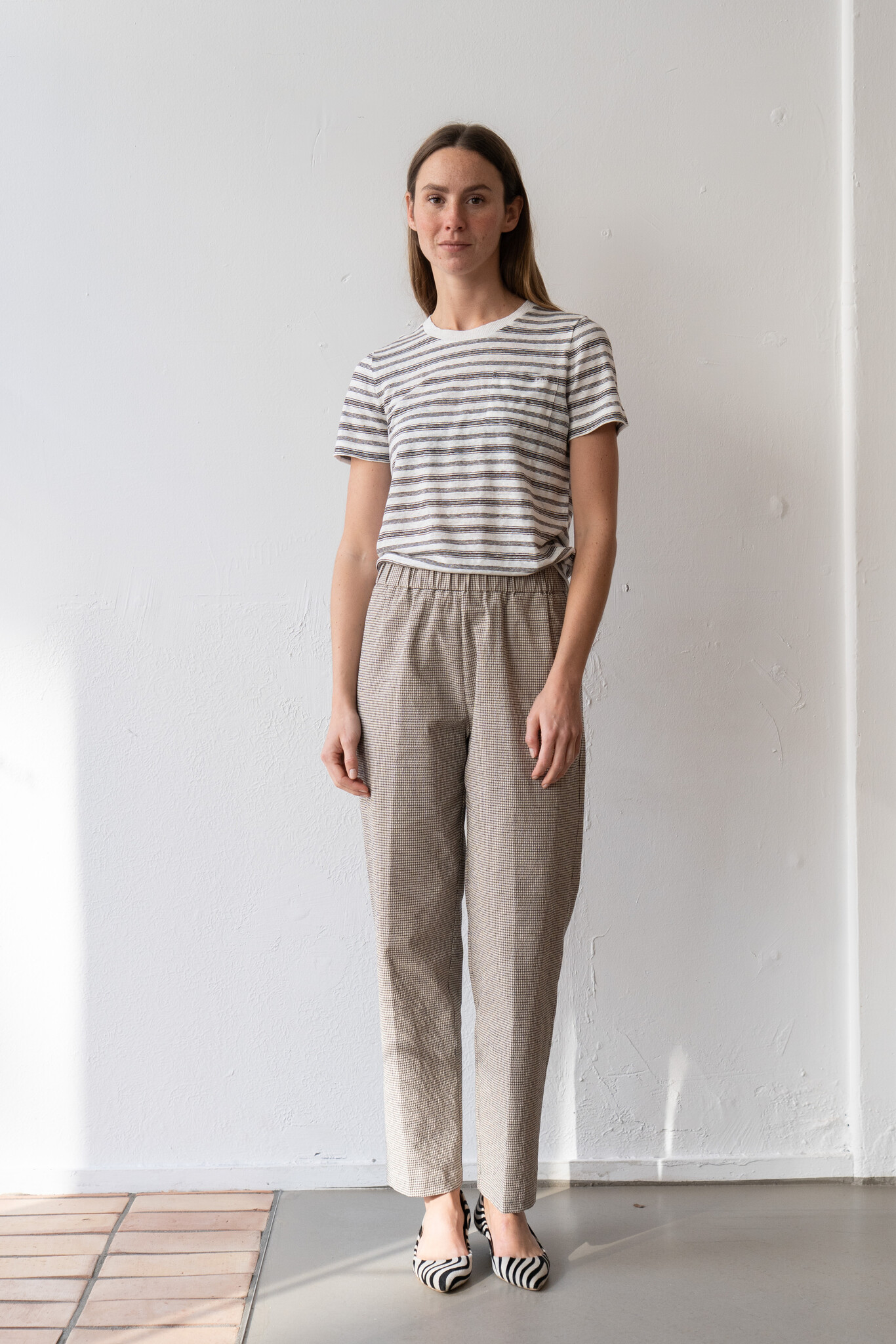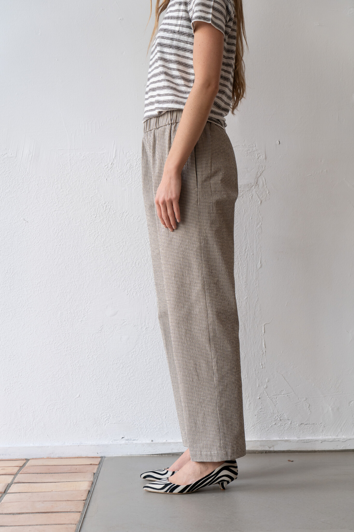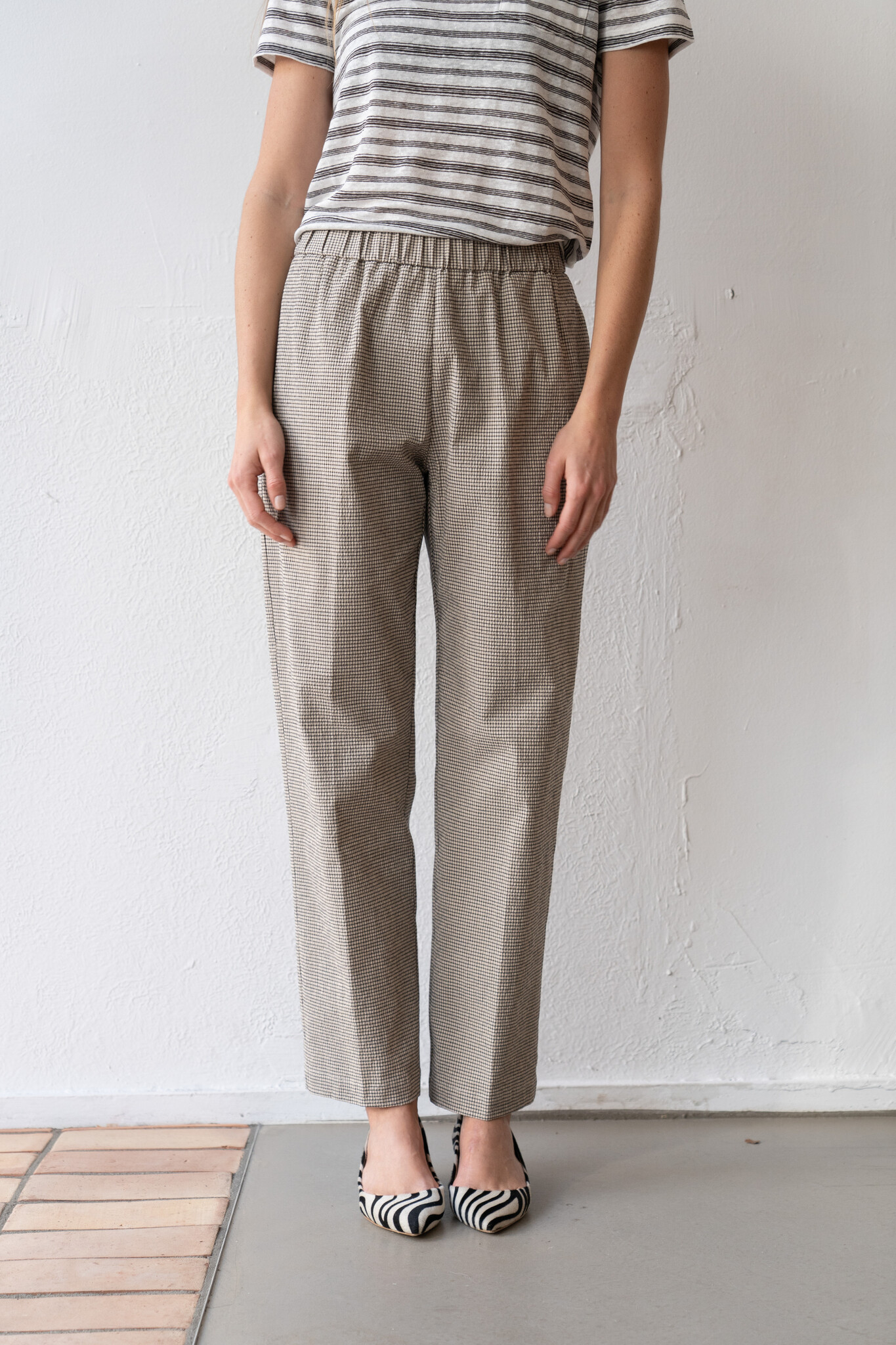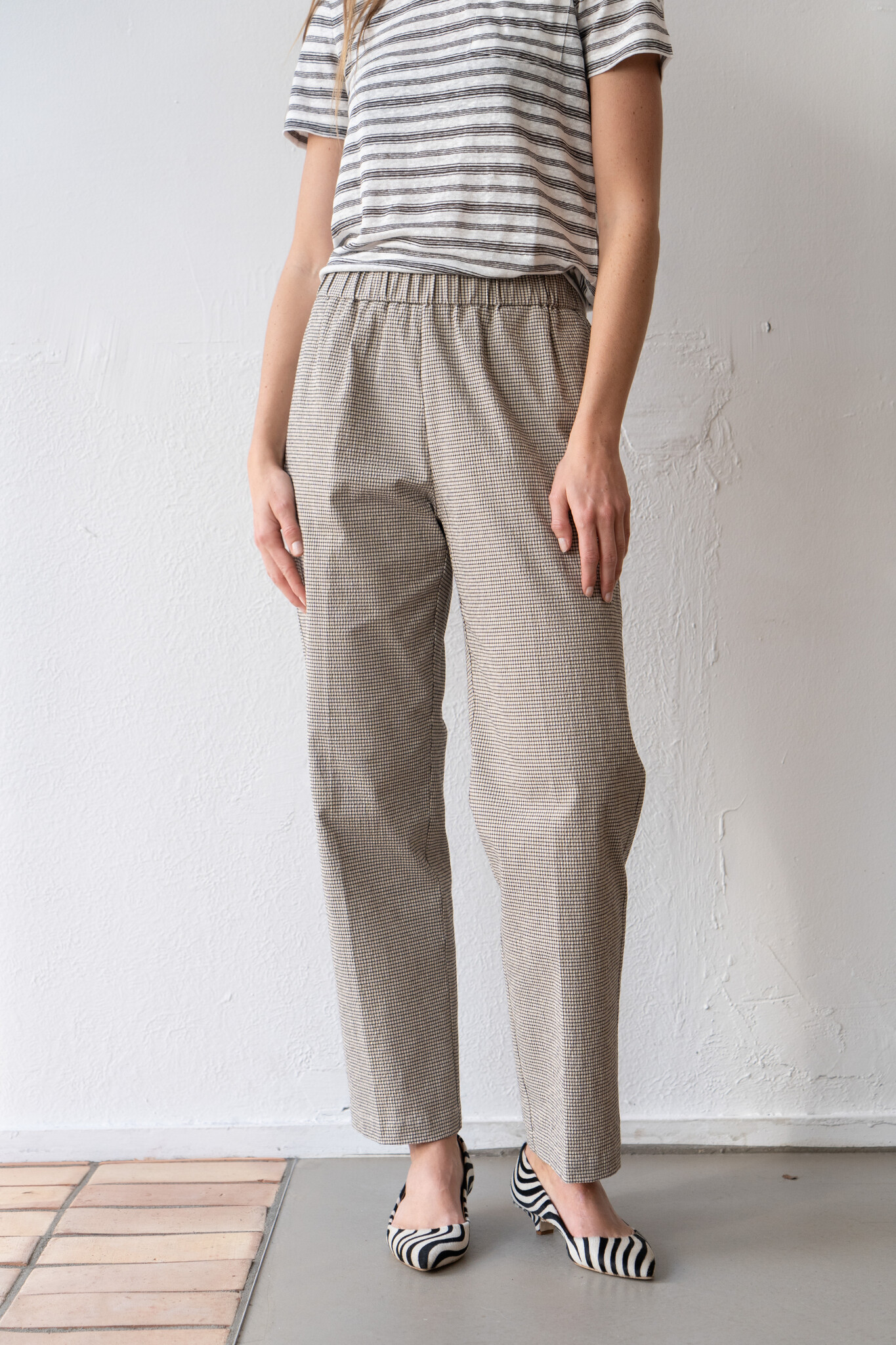 Elastic waistband cotton brown micro-gingham trousers by Pomandère.