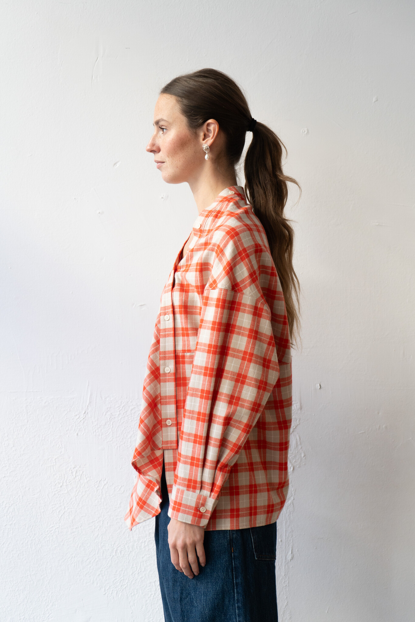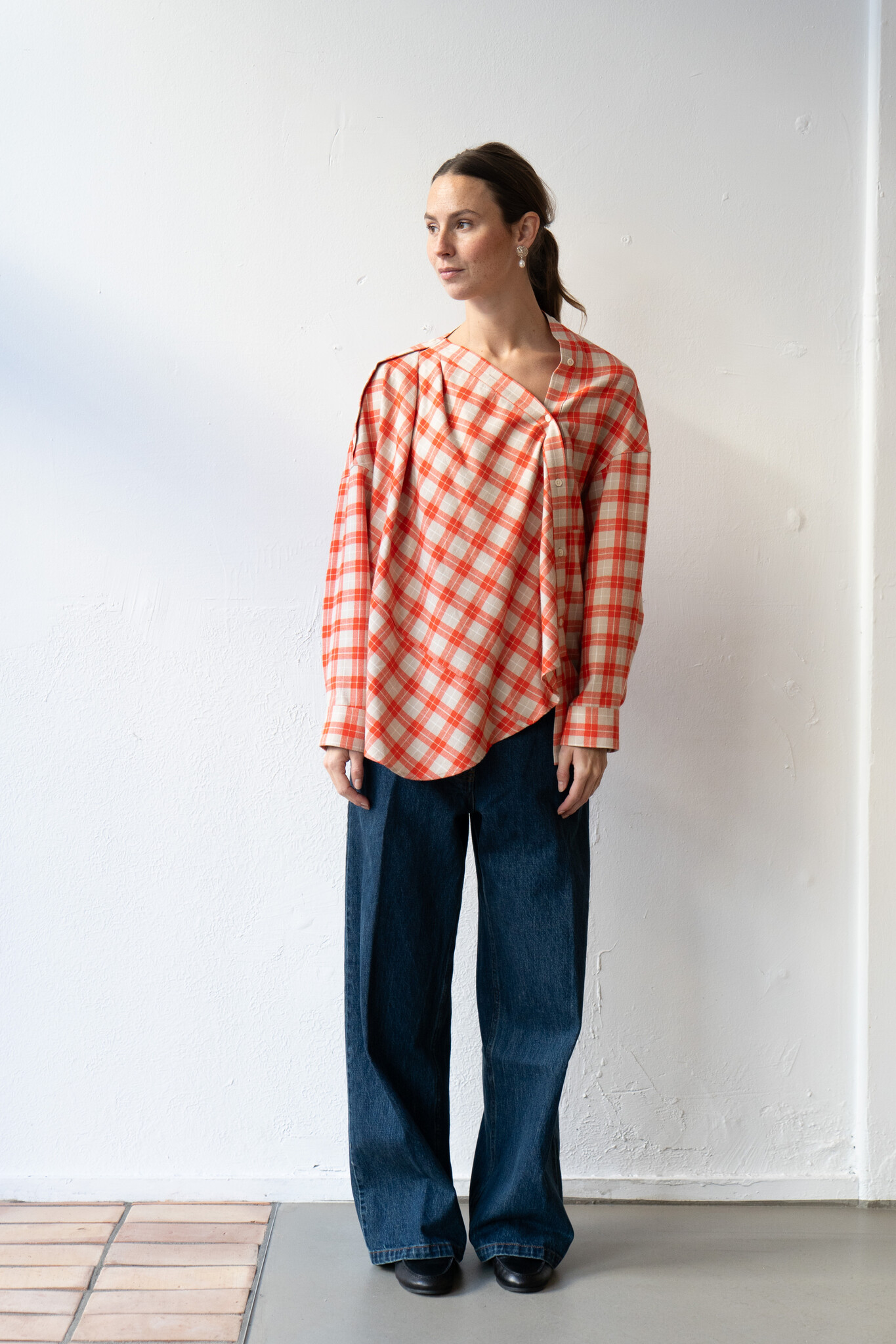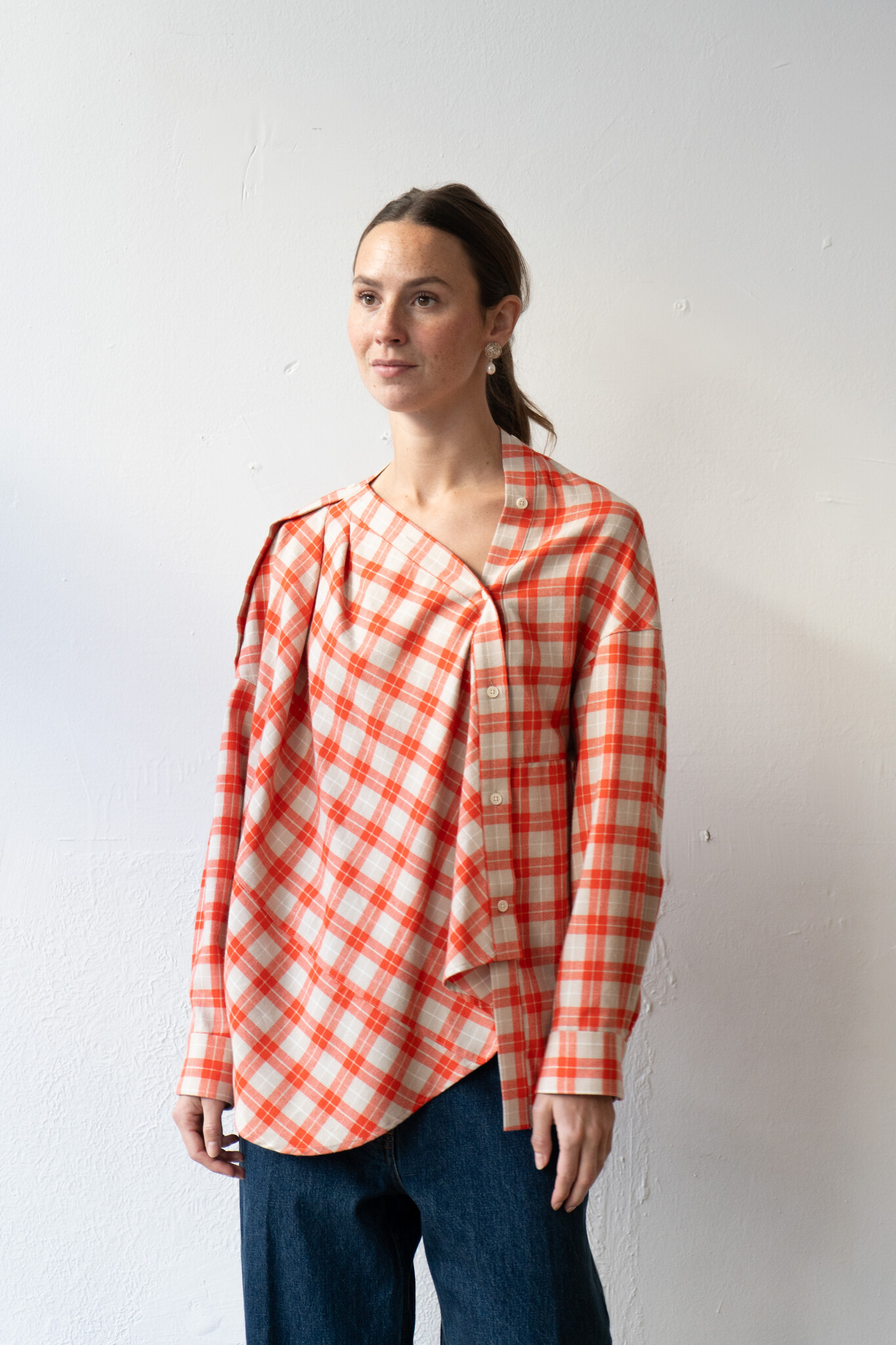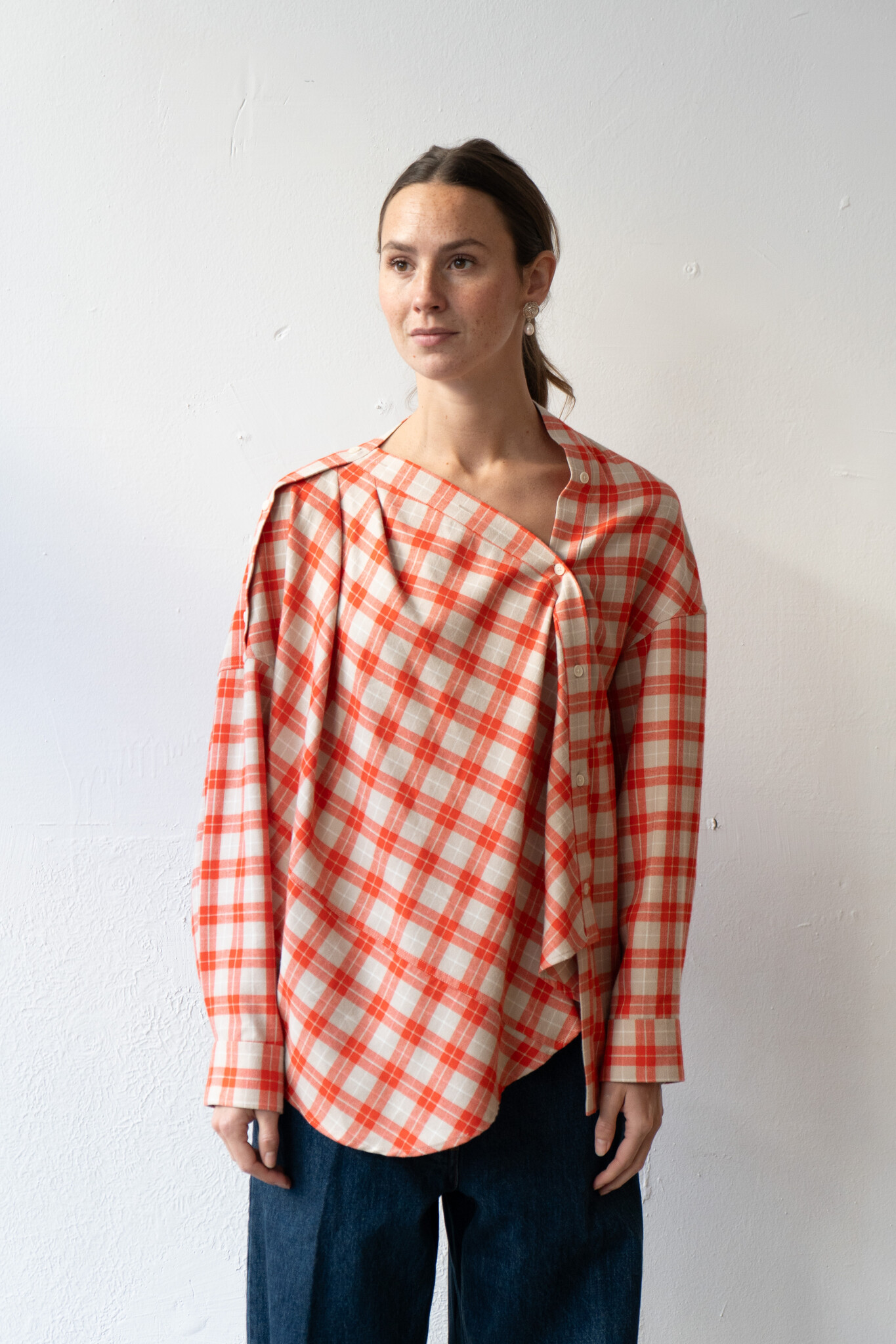 Long-sleeved top cut by Rachel Comey from lightweight flannel with an allover plaid pattern. Features a relaxed, draped silhouette with dropped shoulders, an asymmetrical button front closure, and a wide neckline that can be worn off-shoulder. Additional button details travel down the shoulder for variable styling. Curved, slightly dropped hem. For when you want to feel unexpected.