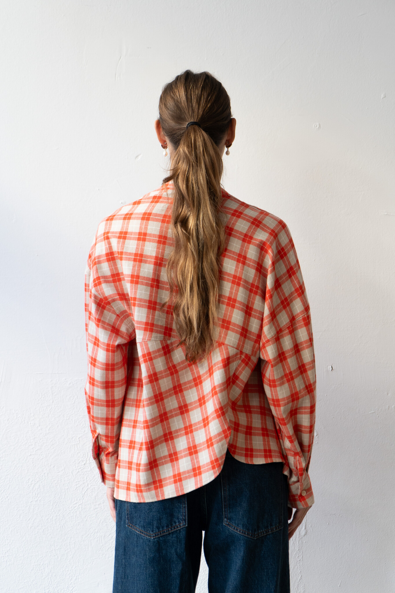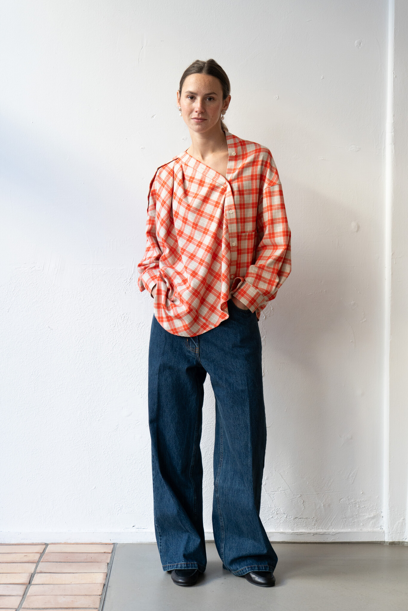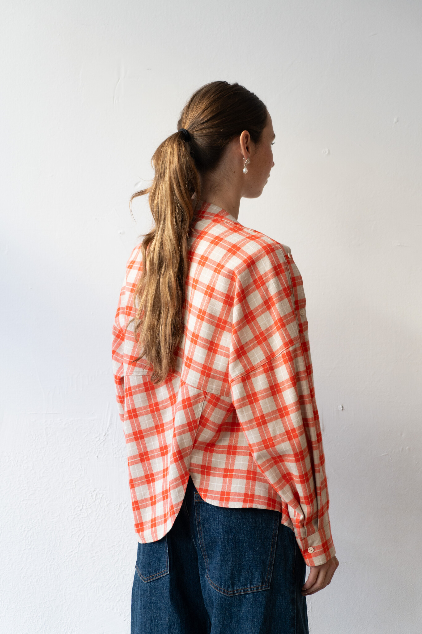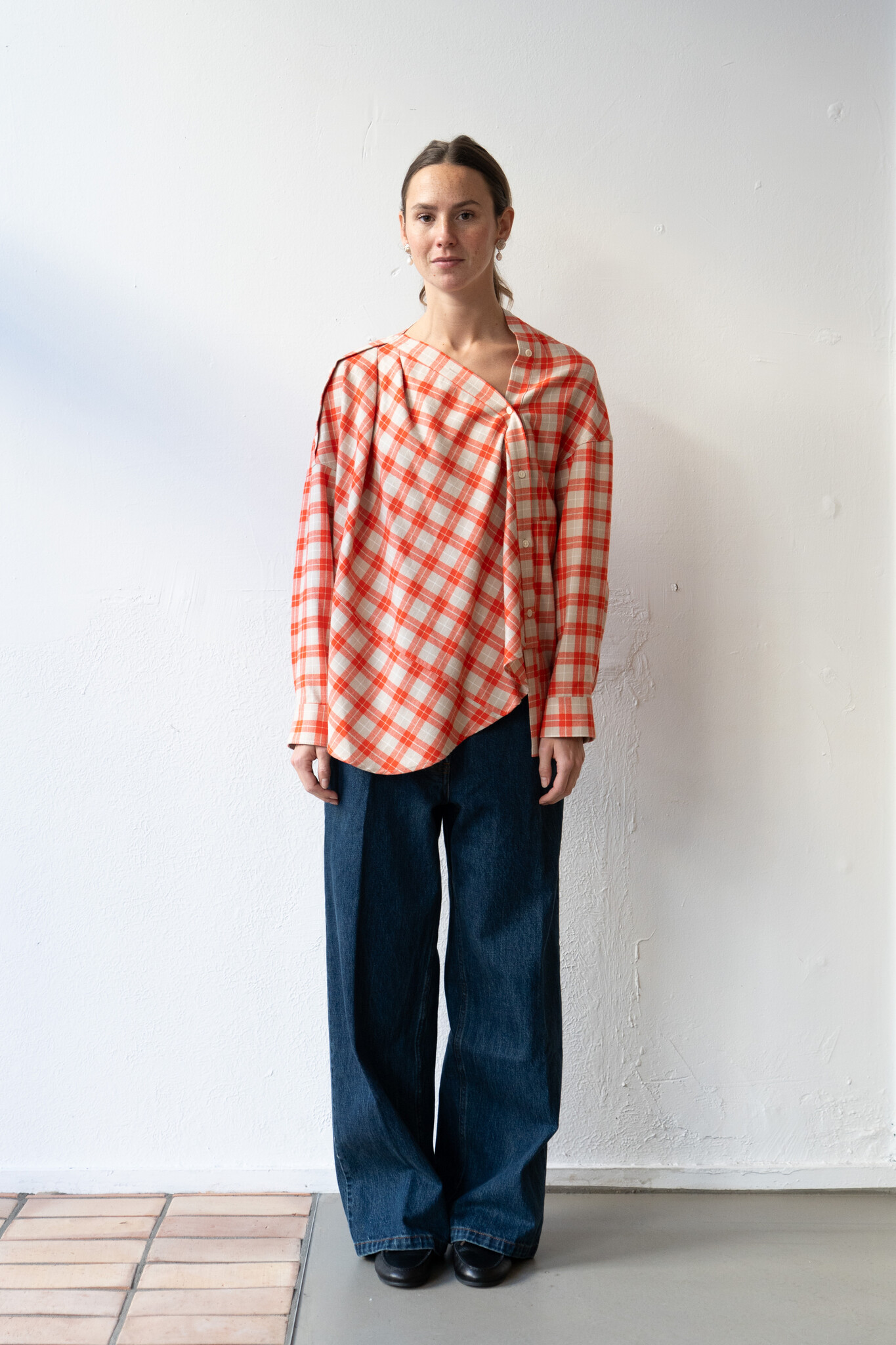 Long-sleeved top cut by Rachel Comey from lightweight flannel with an allover plaid pattern. Features a relaxed, draped silhouette with dropped shoulders, an asymmetrical button front closure, and a wide neckline that can be worn off-shoulder. Additional button details travel down the shoulder for variable styling. Curved, slightly dropped hem. For when you want to feel unexpected.