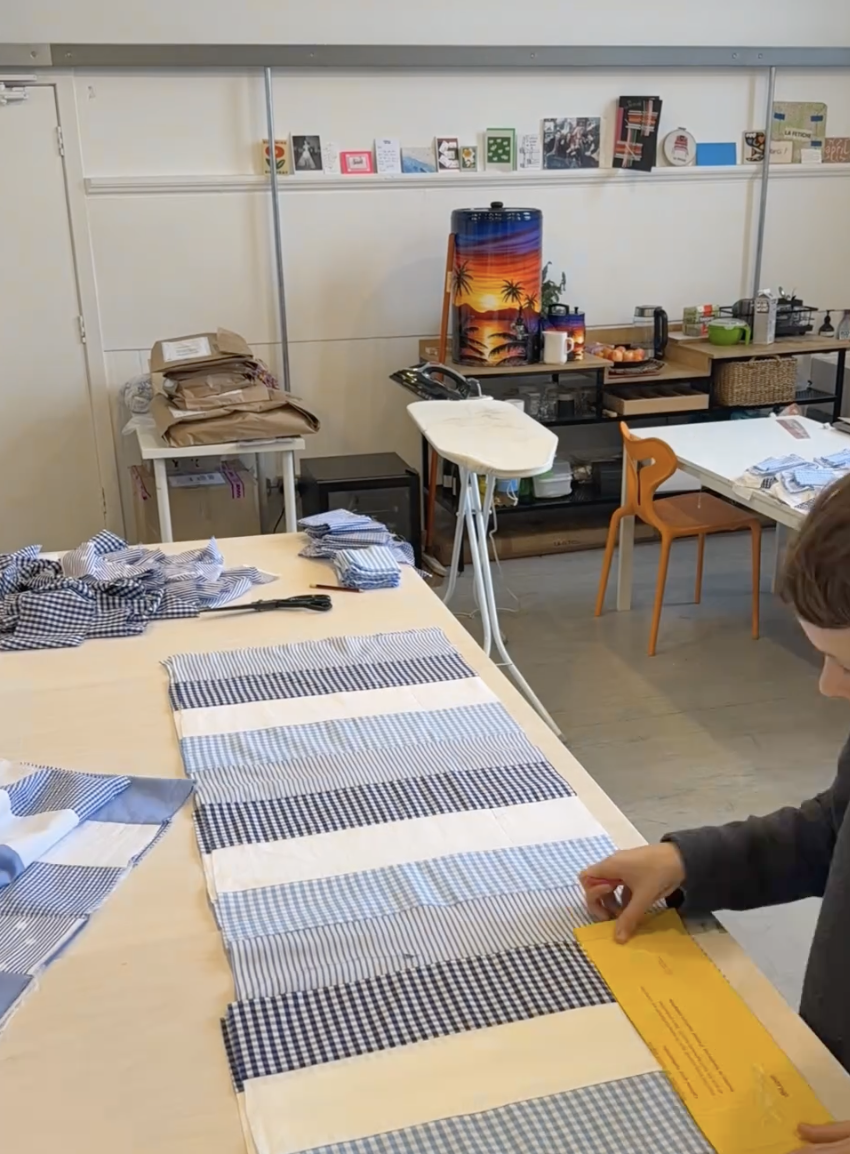 Made using surplus fabrics from previous seasons & upcycled mens shirts. 100% Upcycled Cotton and French Broderie Anglaise details. Made in Bulgaria
