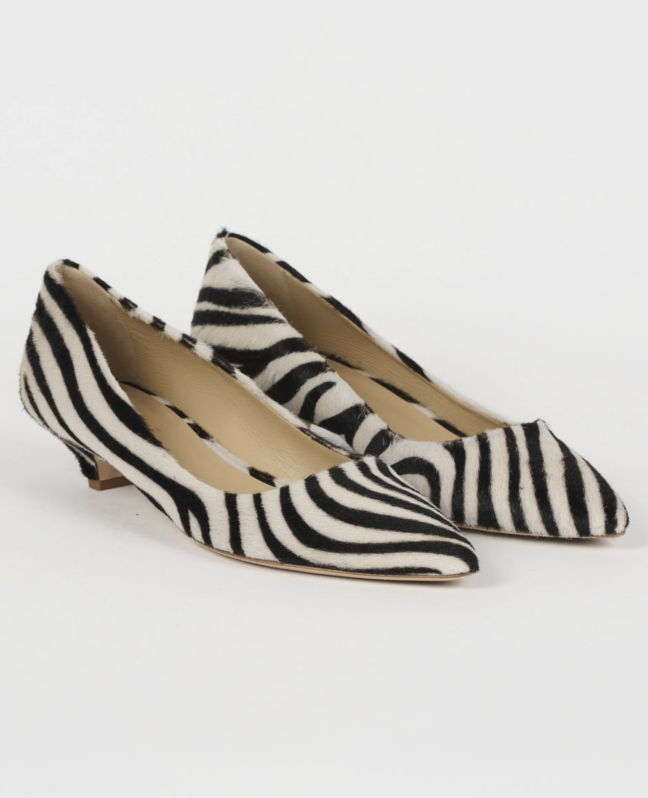 A classic kitten in a working girl shape by Jamie Haller . A soft and comfortable pump with a beautiful shaped pointed toe. Leather sole with anti slip rubber injection. Super soft calfskin with hair, dyed in a zebra print.