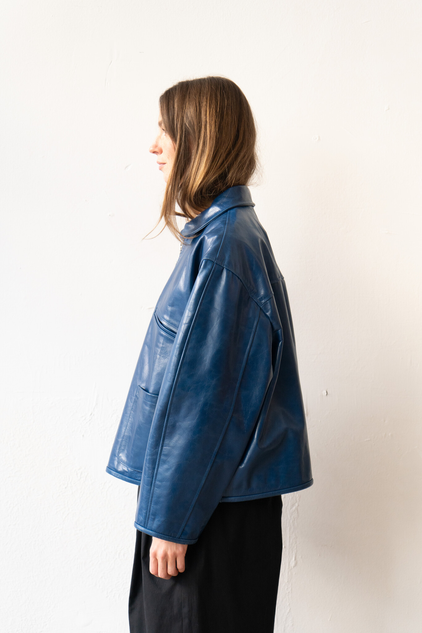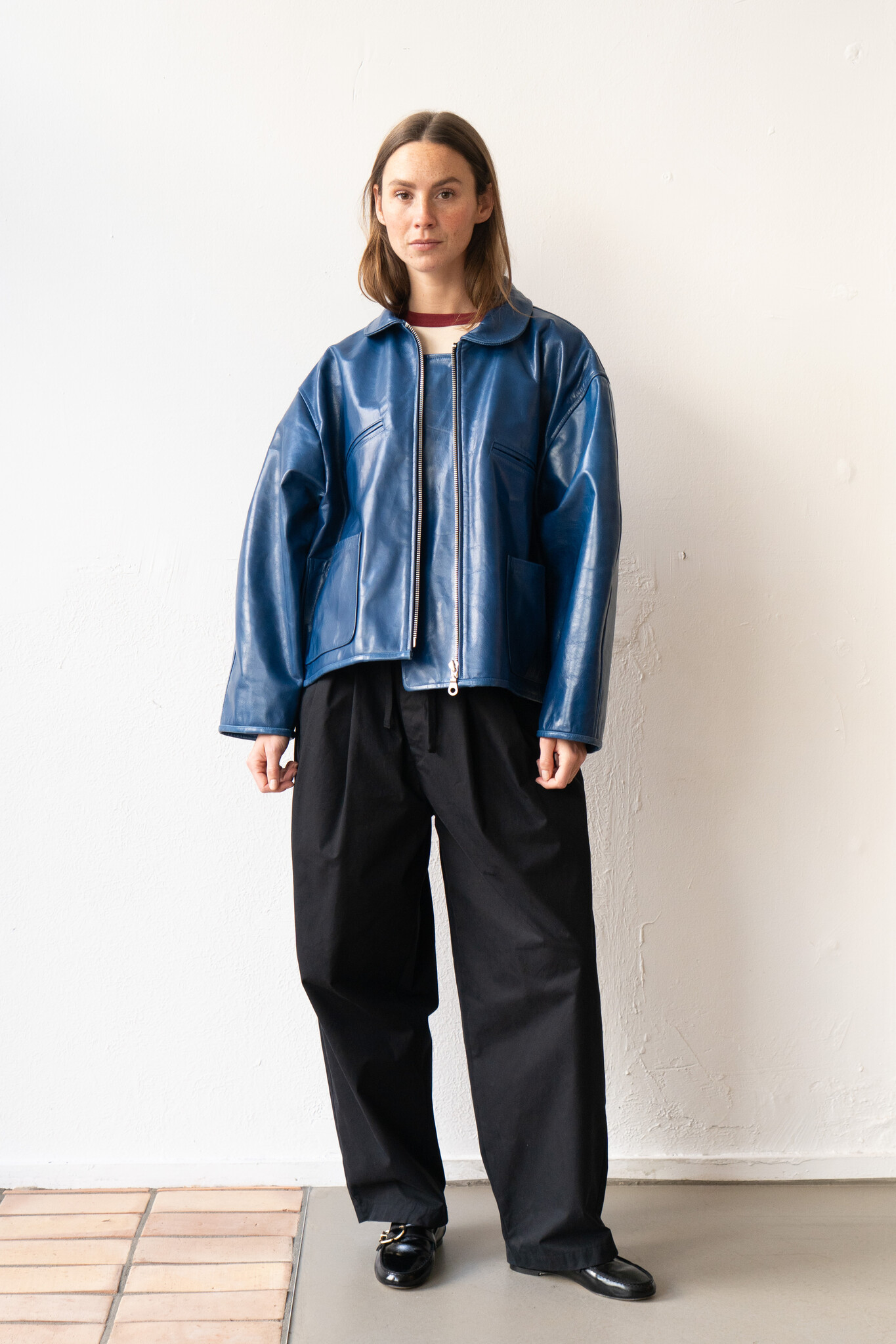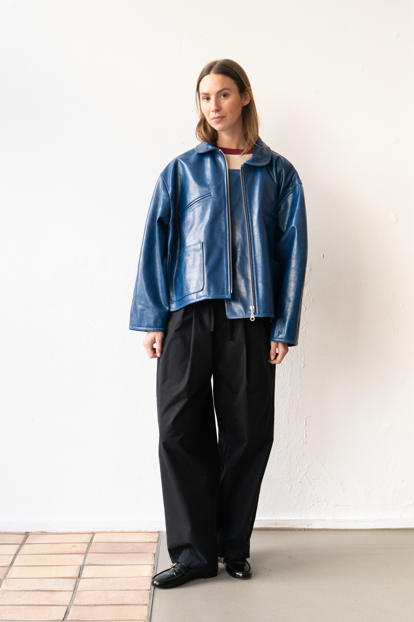 Inspired by vintage aviation jackets, the leather flying jacket by Cawley has a loose and semi-cropped silhouette. Cut from a soft, unique blue coloured leather, the jacket is finished with two patch pockets, chest jet pockets, matching leather binding, and an overlapping zip closure. The purposeful, roomy fit allows you to wrap up in the cooler months.