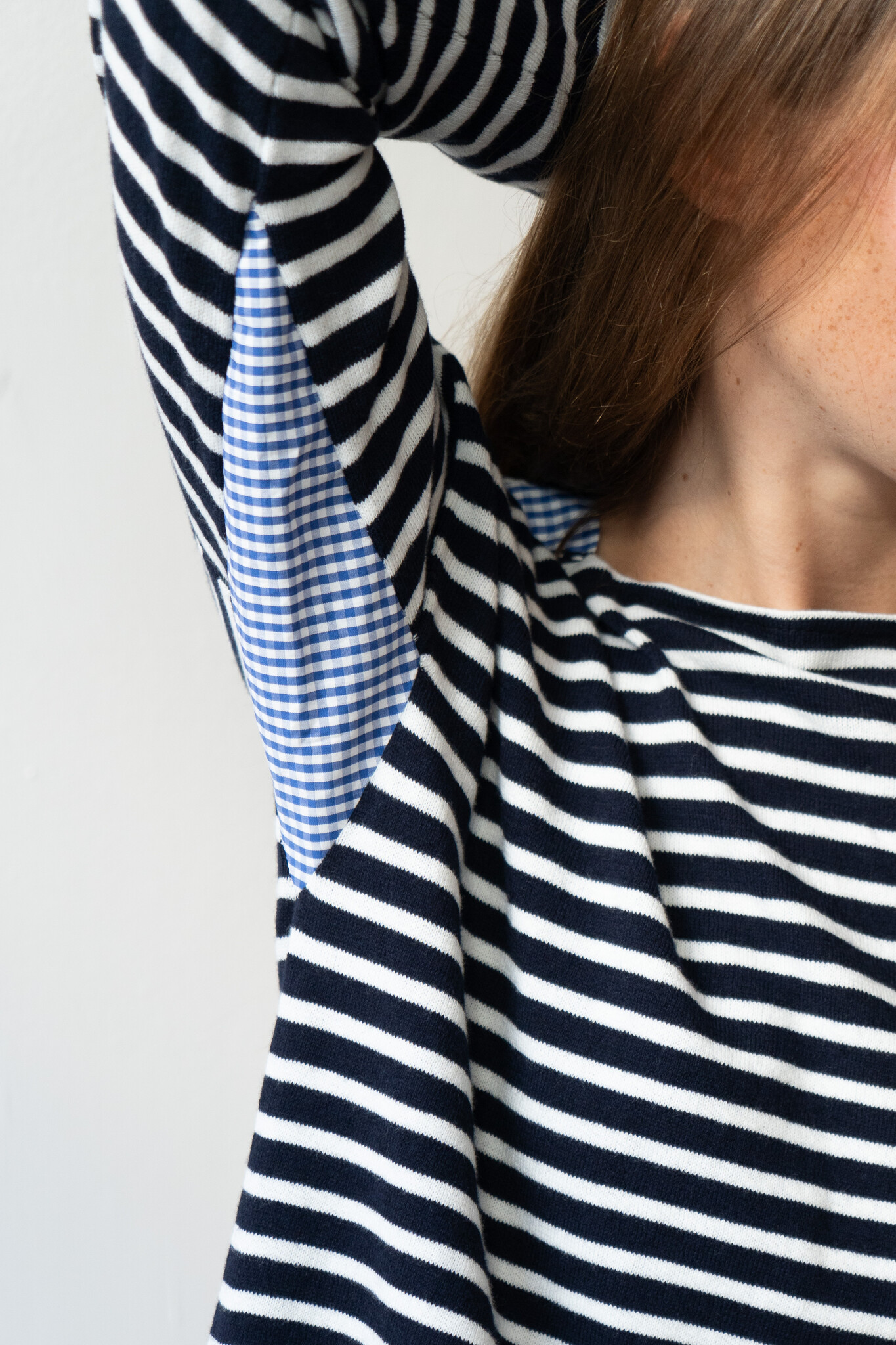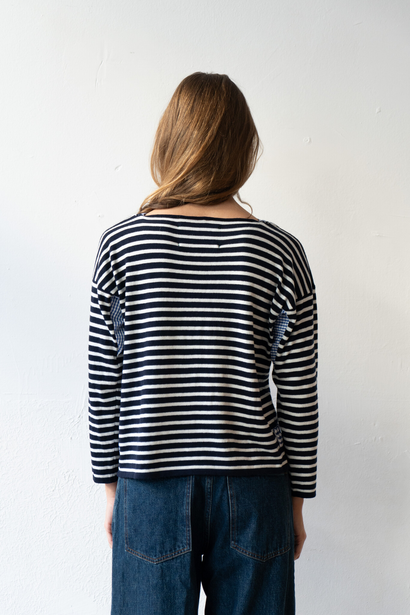 La Fetiche LEO LOOSE FIT STRIPED SWEATER with gingham details with hand-embroidered LA FETICHE patch.