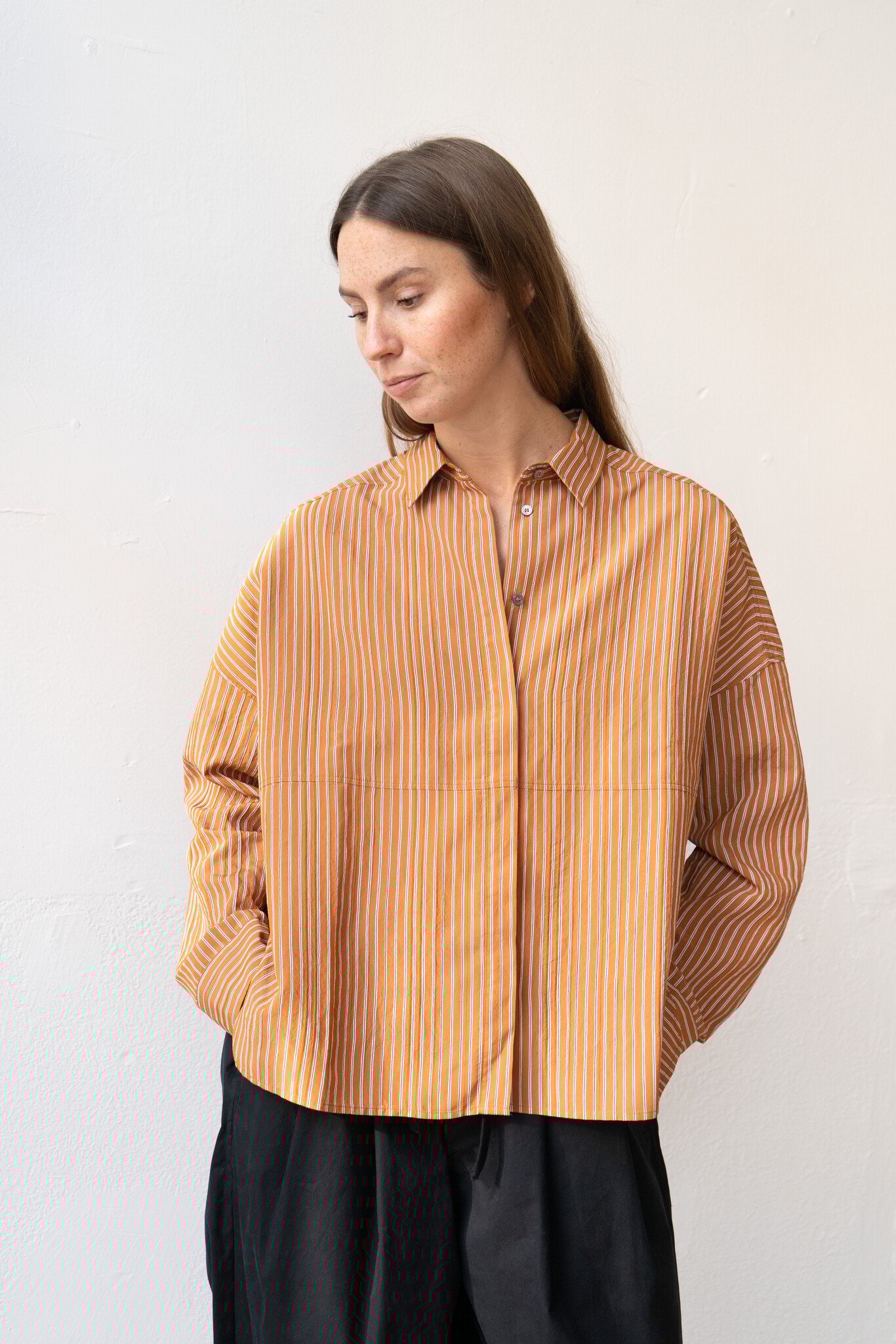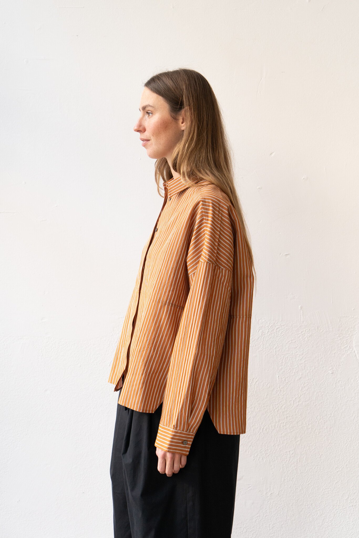 This loose fit burnt orange stripe shirt by Pomandère, highlighted by the classic collar, is combined with details that enhance the garment’s structure, such as the hidden button placket and cuts. The dropped shoulders emphasize the contemporary style of the piece. The fit provides relaxed volumes. The slightly raised texture of the striped technical viscose poplin creates a subtle wavy and slightly crisp effect.