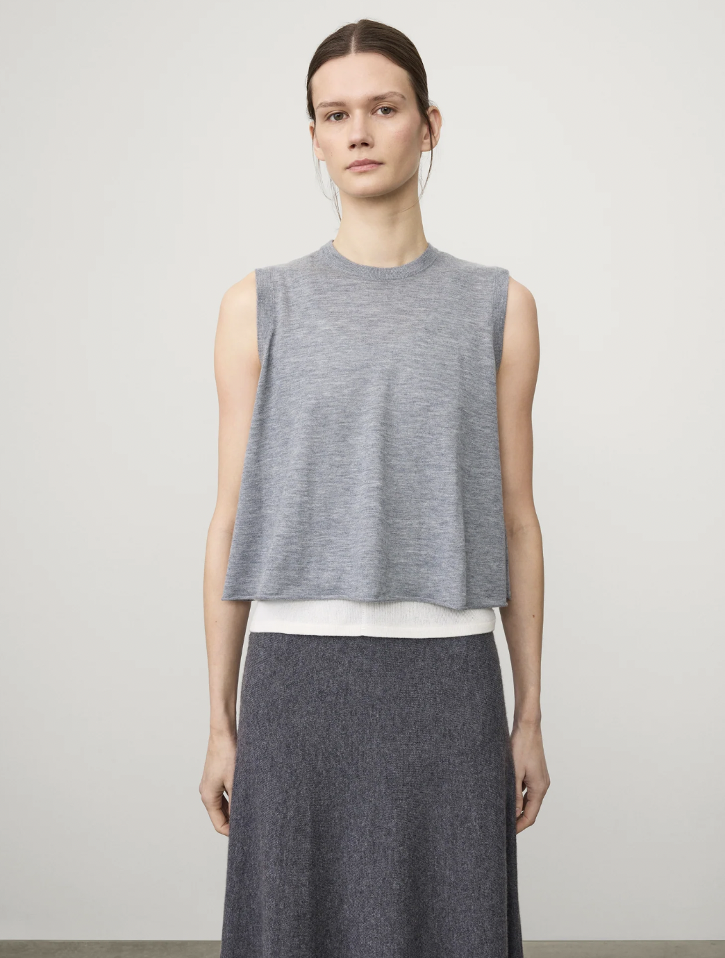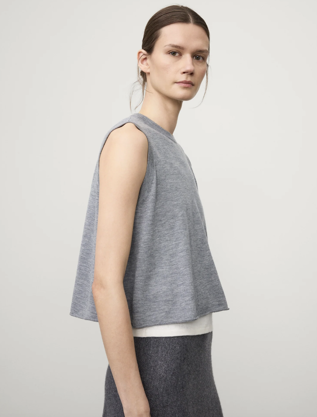 The Nali Top by Lisa Yang. An airy first layer, the Nali top is crafted in the finest, most delicate 18-gauge cashmere. The piece is fitted at the shoulders and falls into a wide, draping silhouette down the hem. It features a crew neck and a cropped hem with rolled edges.