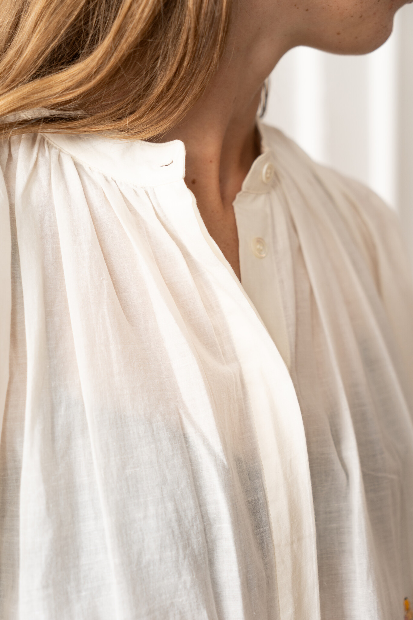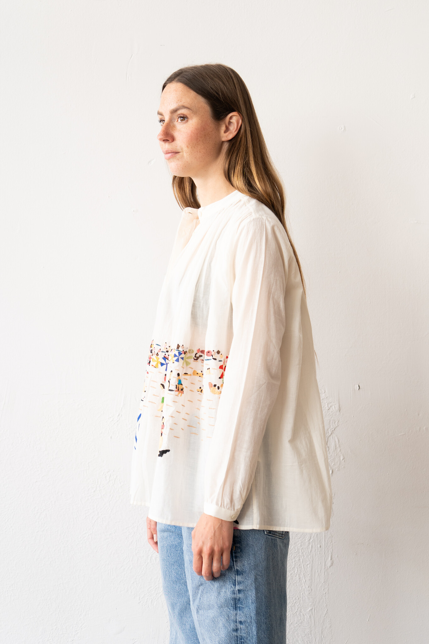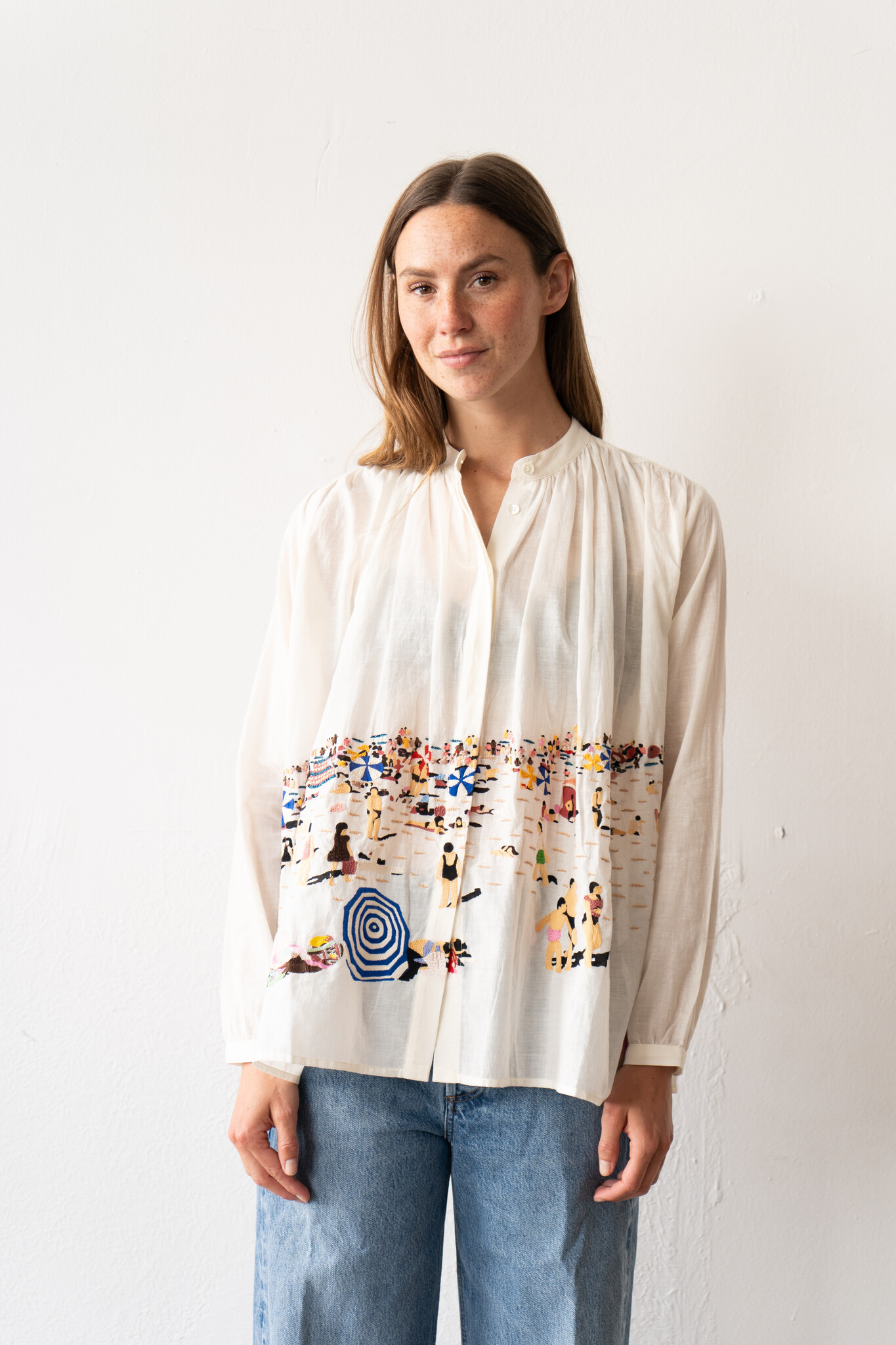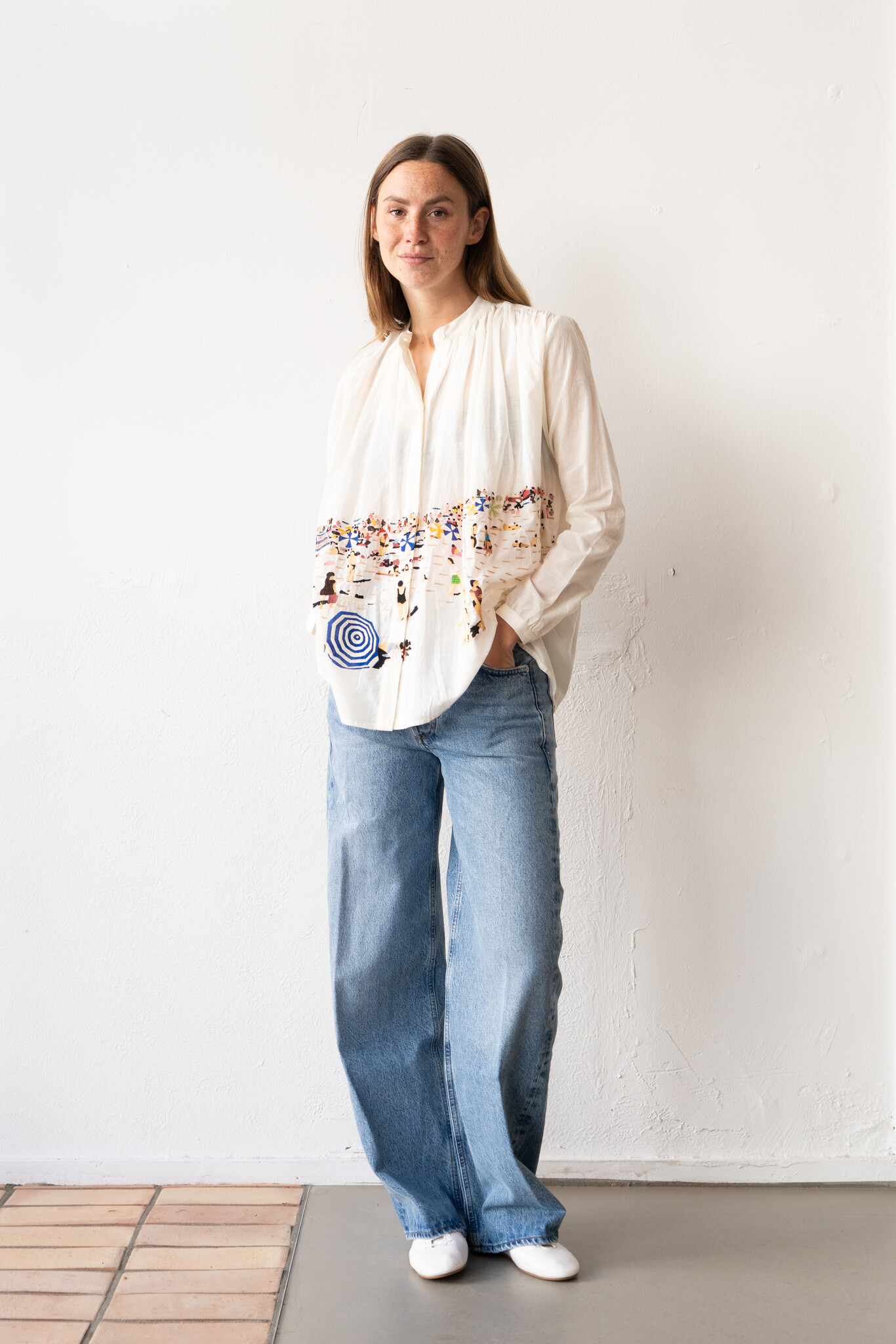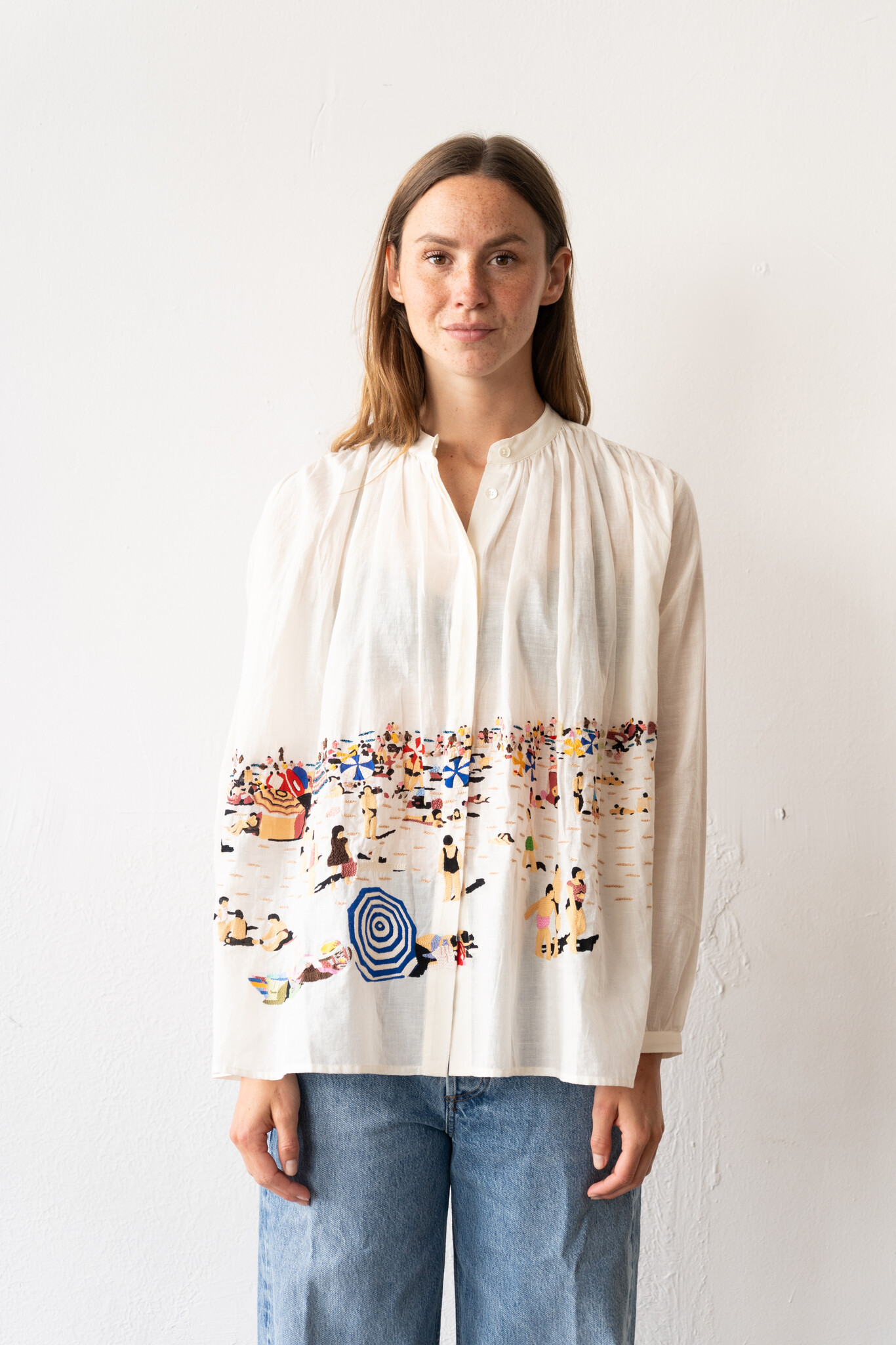 The Nathalie shirt by Mii is entirely hand-woven from airy khadi cotton. Its hand-embroidered design evokes the iconic theme of holiday postcards: summer beach scenes!