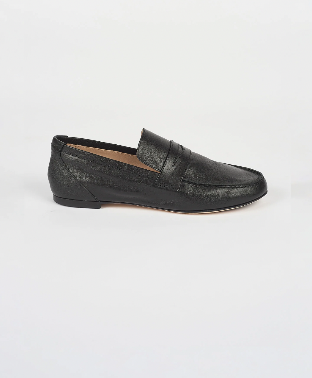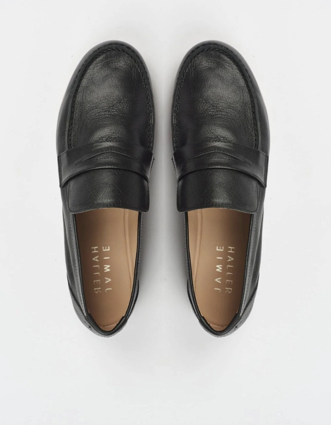 The Penny loafer in black by Jamie Haller. Inspired by the classic silhouette of a men’s Italian loafer with the understated soul of a slipper. Handmade in Tuscany, in an old world Atelier using bespoke Sacchetto construction for a fit and feel you can’t unsee. Made in Italian hand-waxed buffalo and lined in very soft leather with a leather sole. These penny loafers have a glove like fit.
