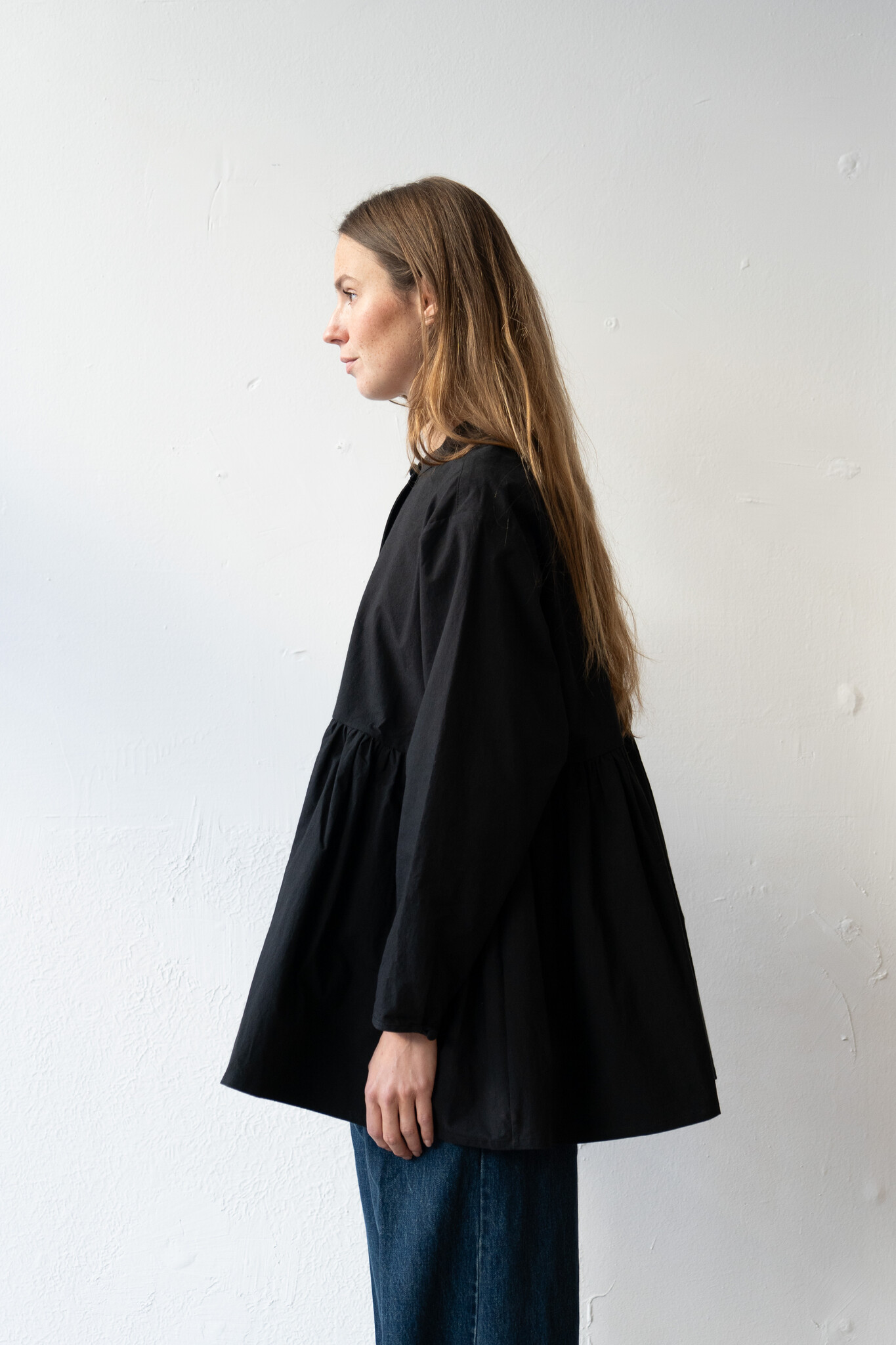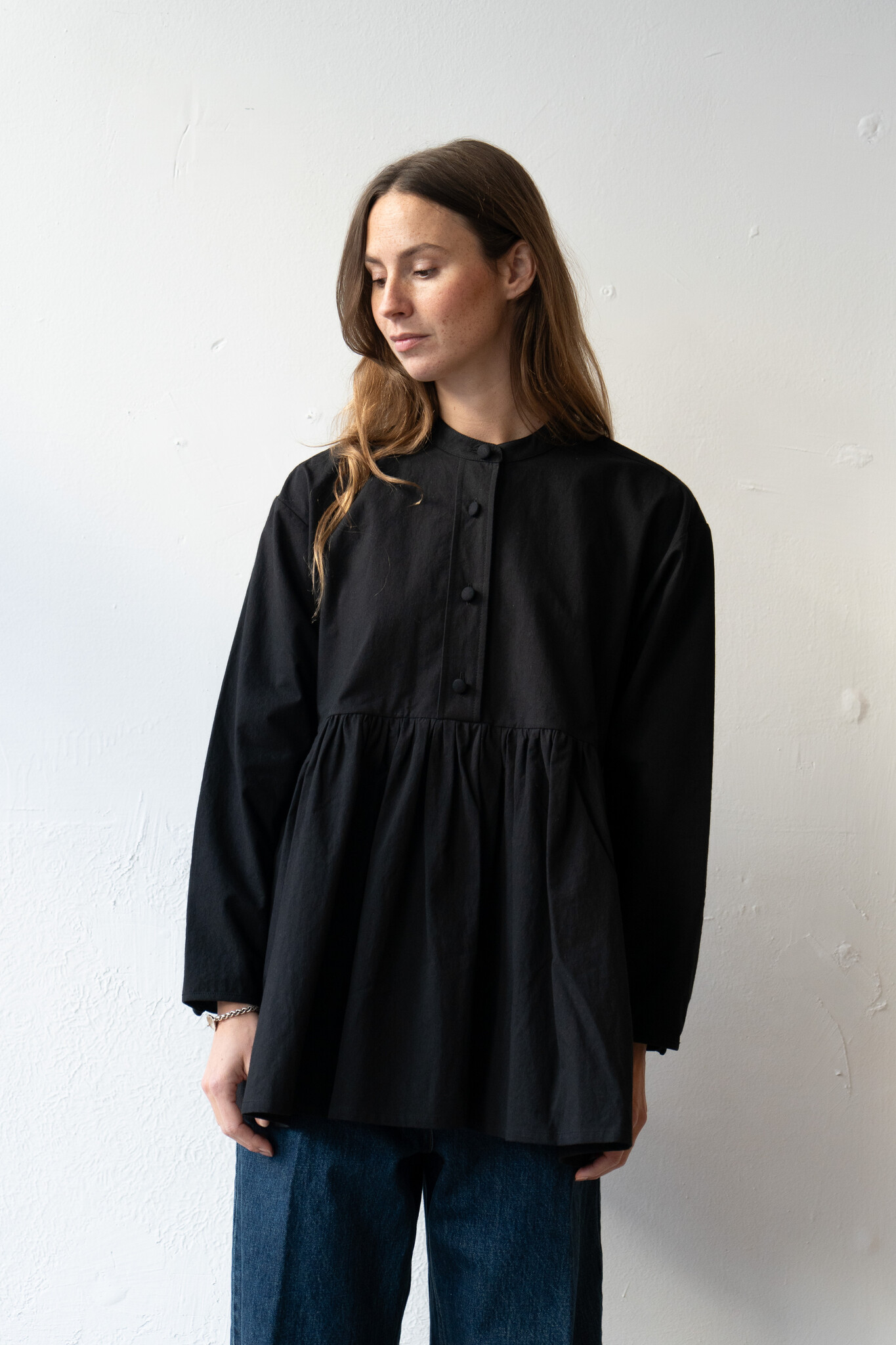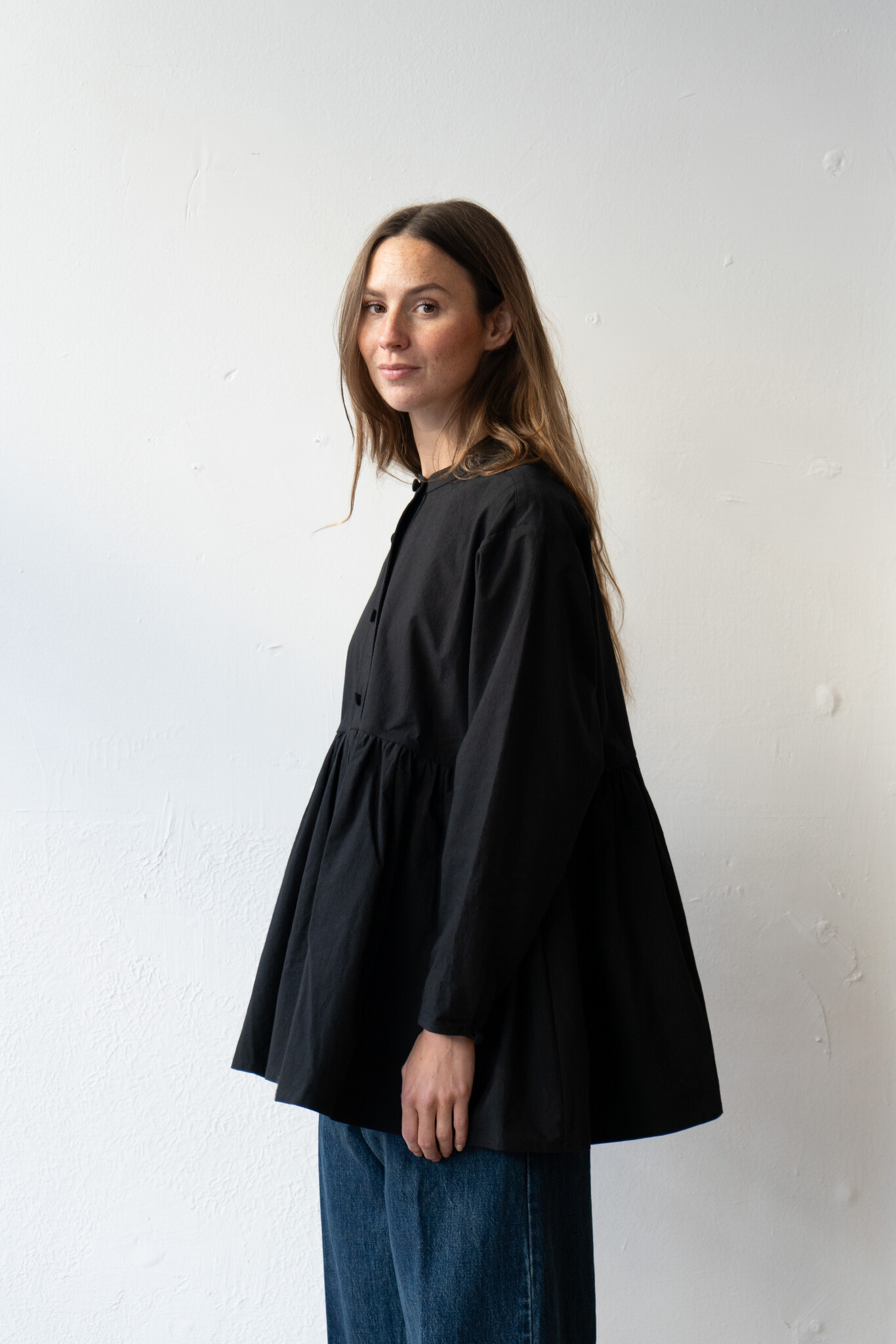 The Penny top by Cawley is a pullover design crafted from a crisp black Japanese cotton. It features a delicately gathered waistline, half button planket and a grandad-style collar. The top is finished with matching covered buttons and a back yoke hanging loop.