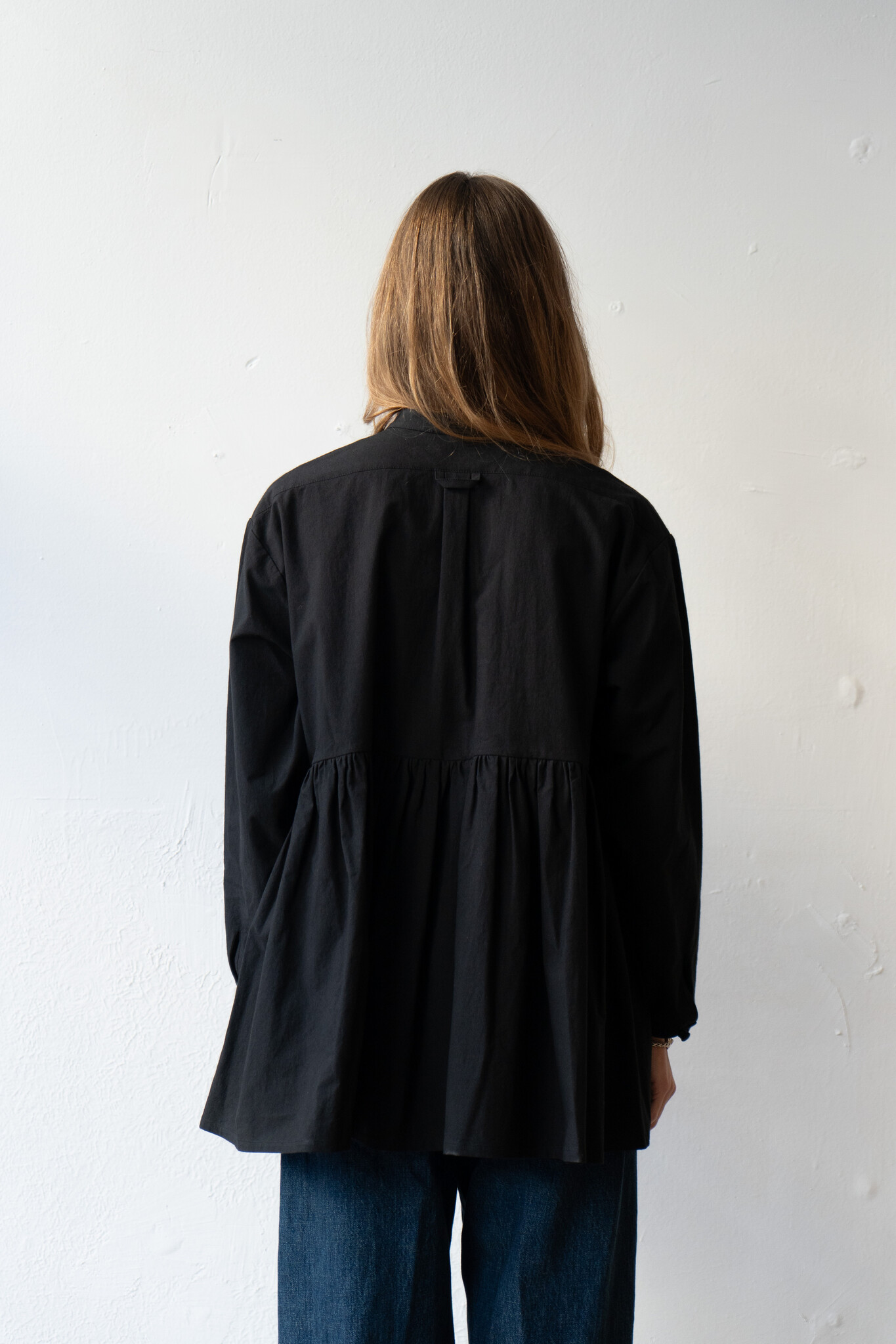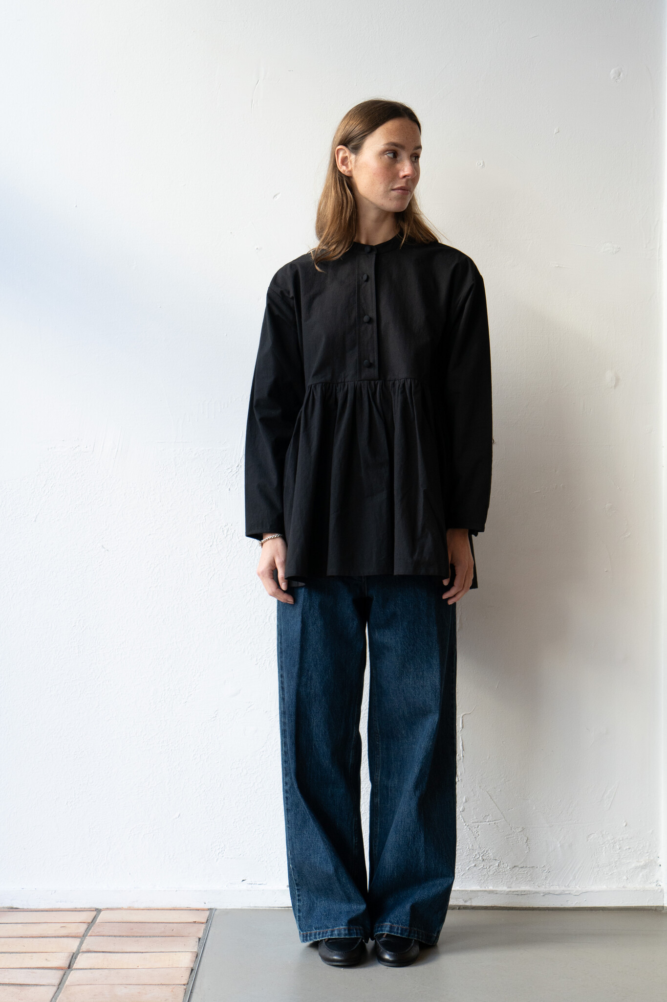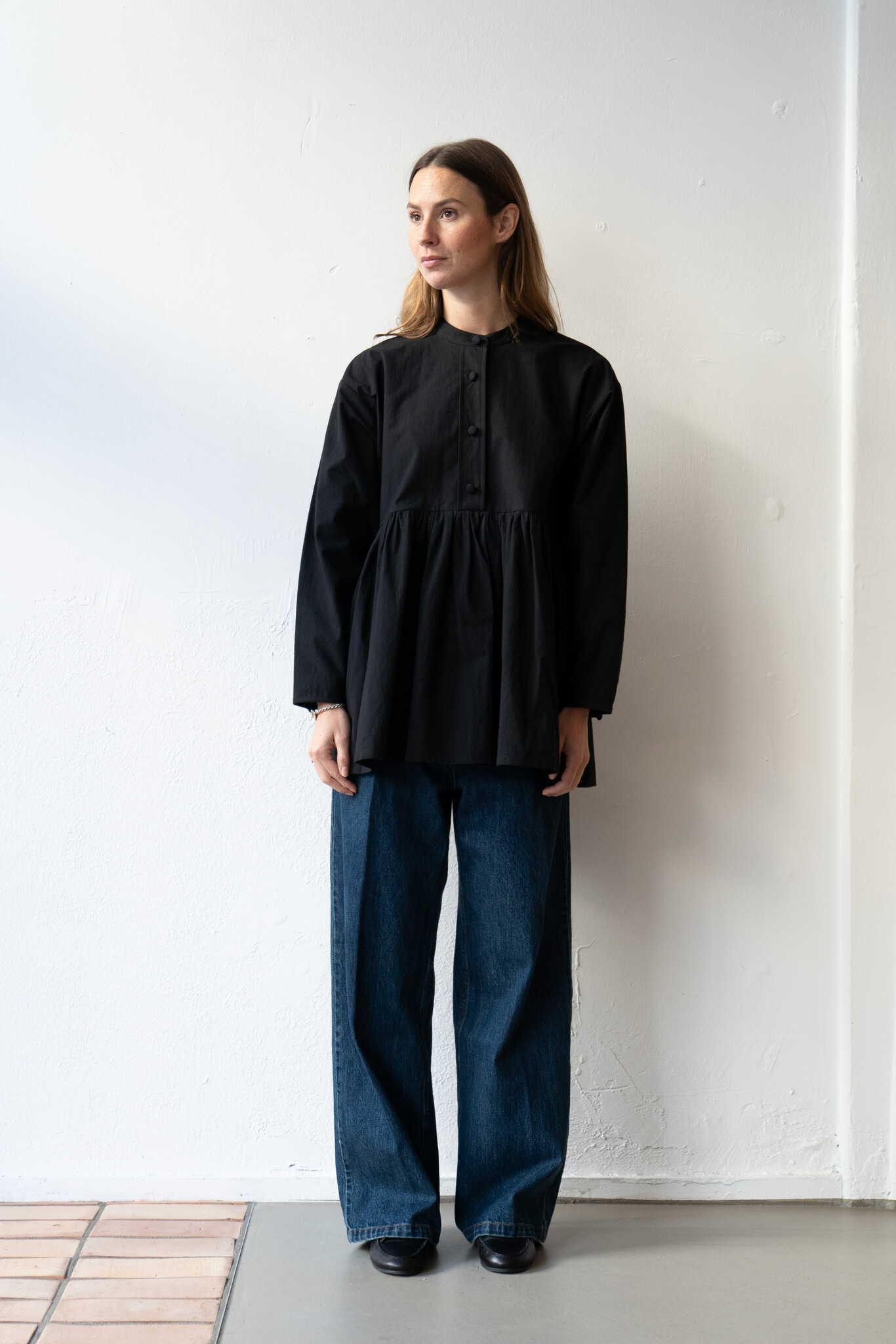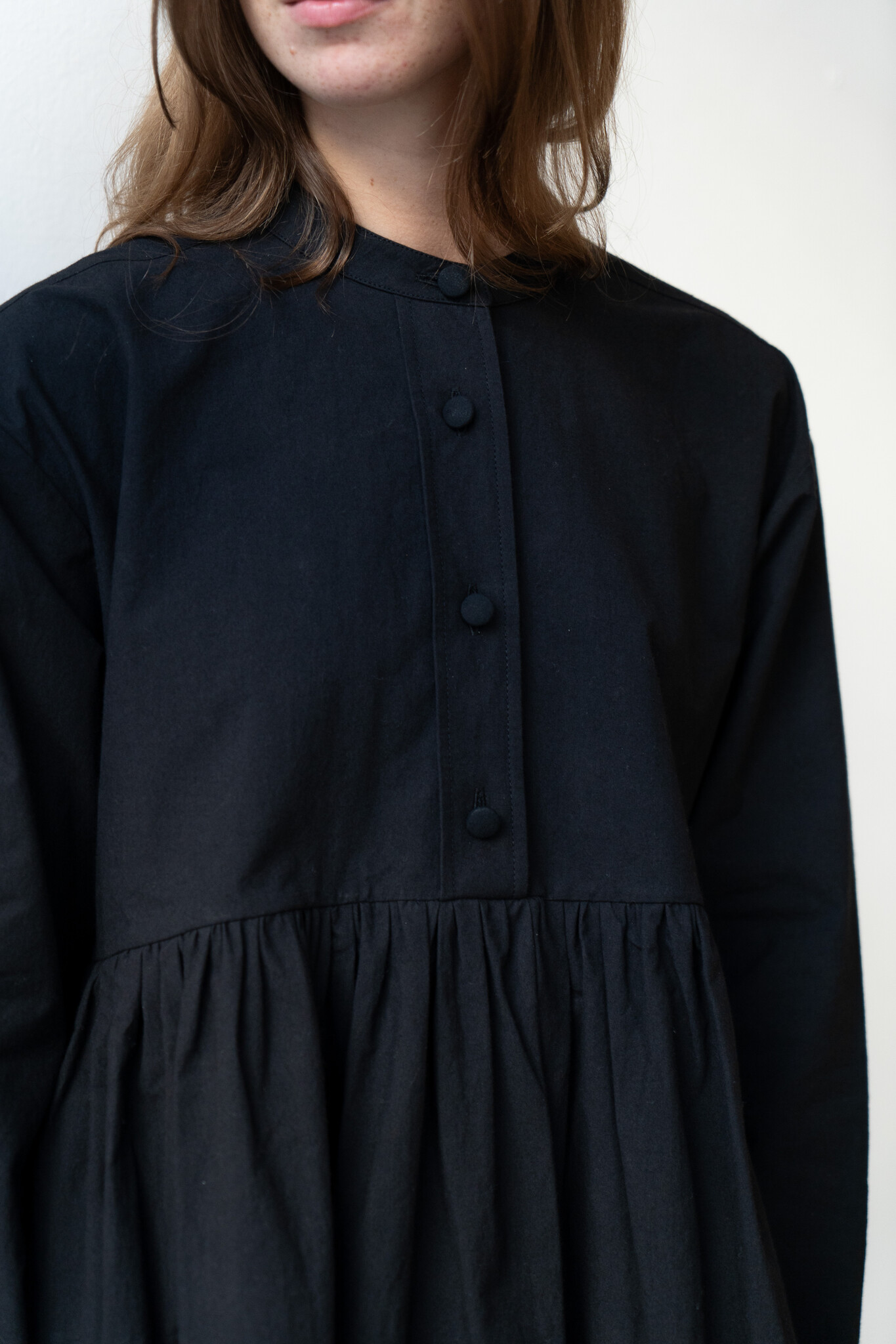 The Penny top by Cawley is a pullover design crafted from a crisp black Japanese cotton. It features a delicately gathered waistline, half button planket and a grandad-style collar. The top is finished with matching covered buttons and a back yoke hanging loop.