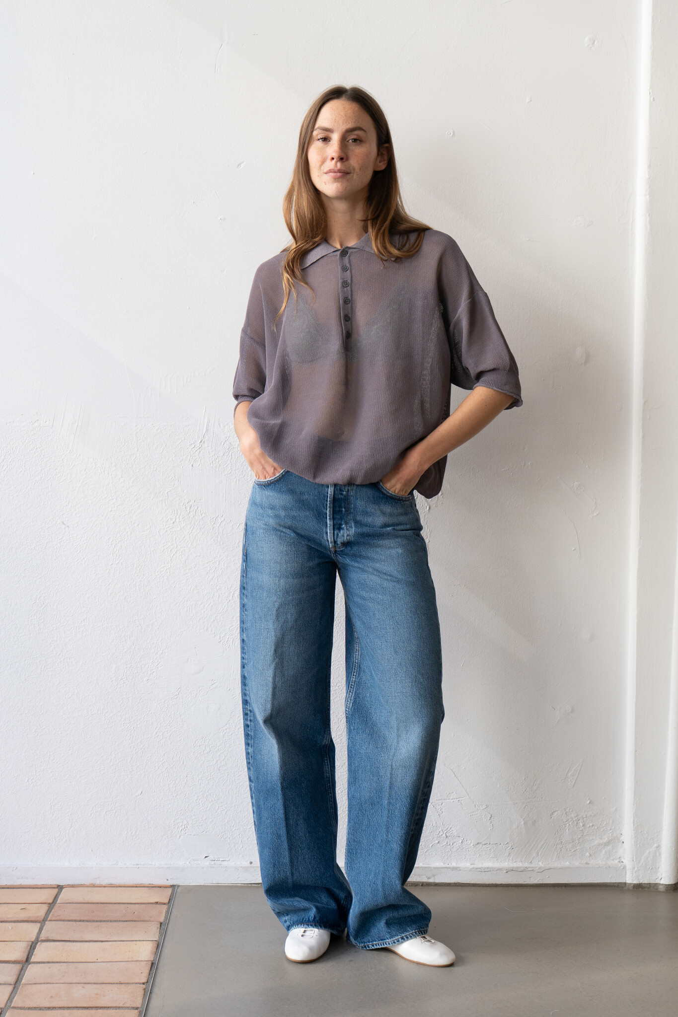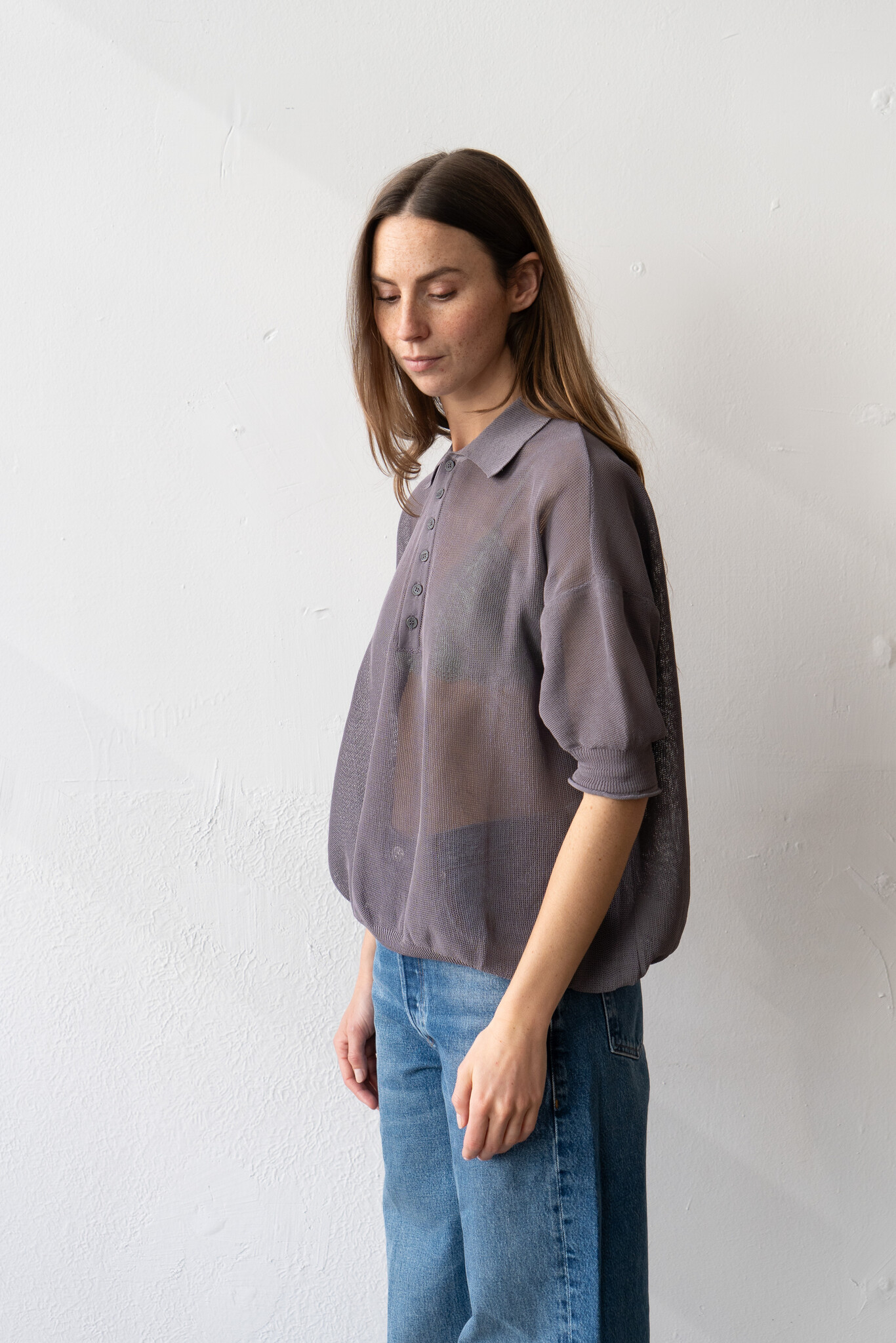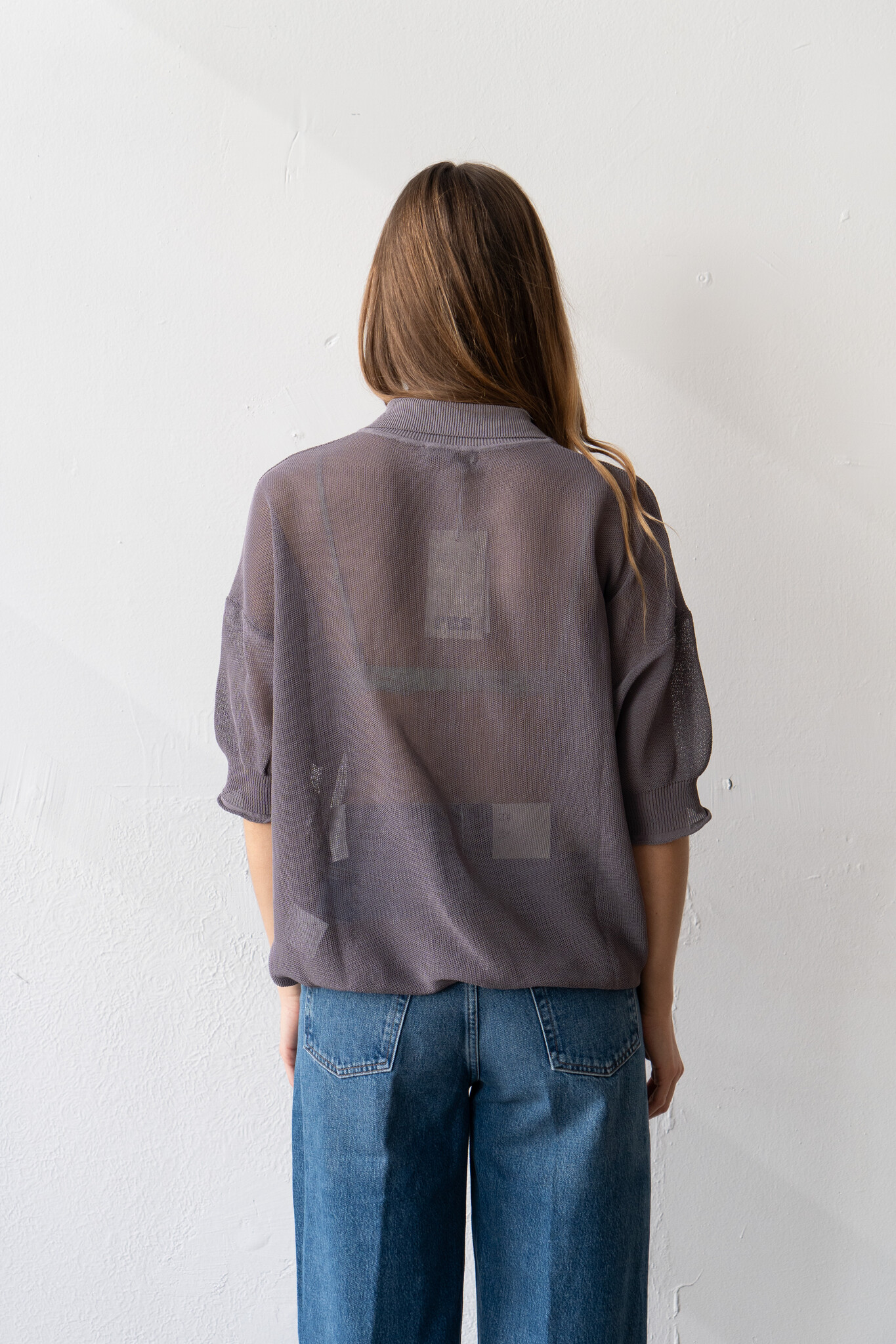 Jushi polo by Rus. Semi-sheer short-sleeved polo crafted from a corded organic cotton yarn with a dry handfeel in a mesh texture. Relaxed silhouette with short and ample sleeves, exposed seams and ribbed trims.