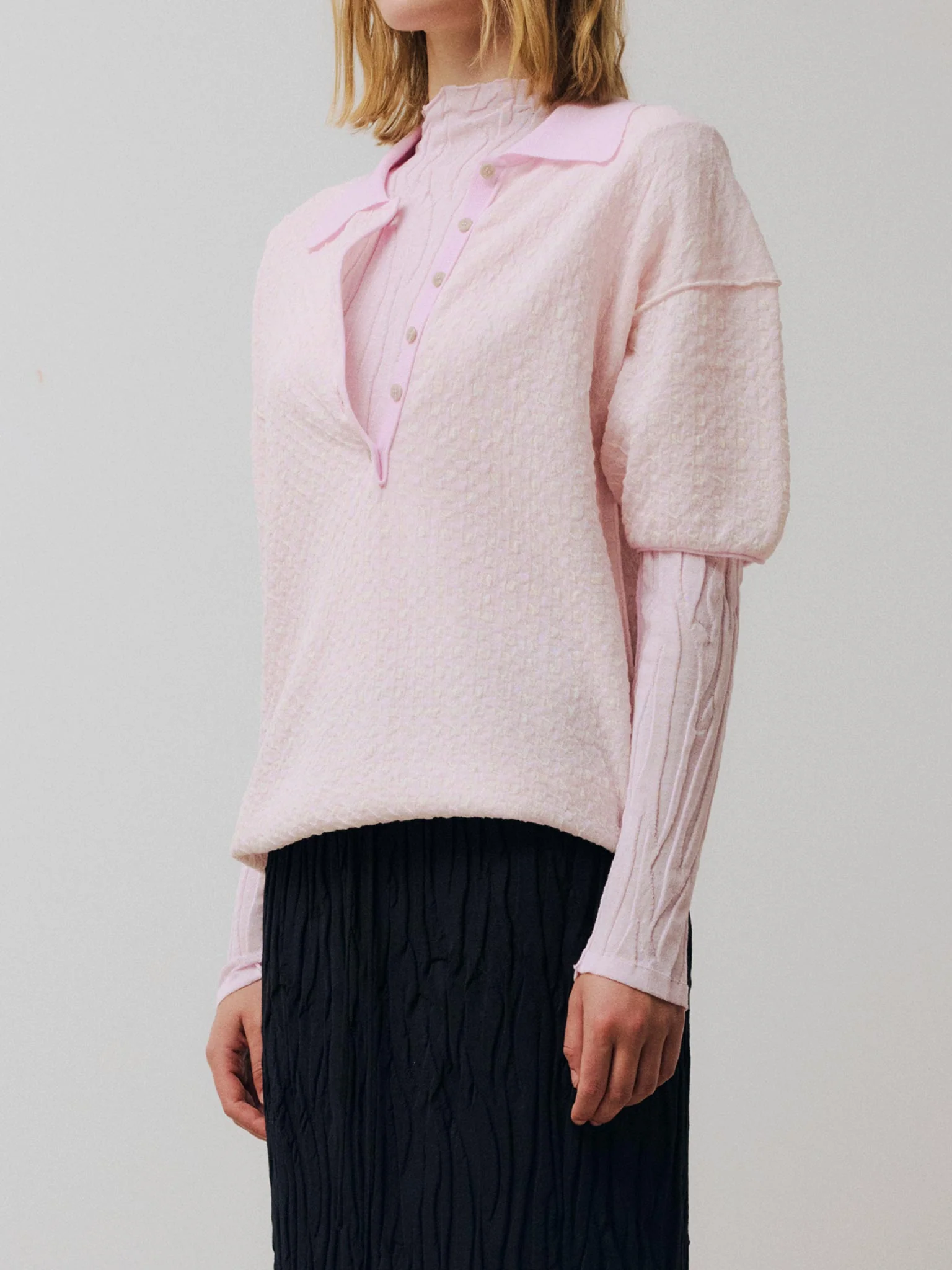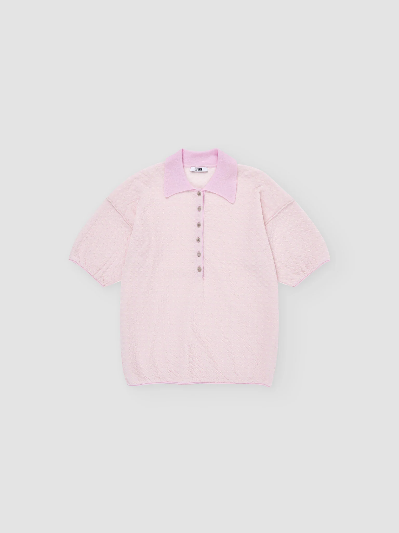 Rus polo Mantel. Short-sleeved polo crafted in a lightweight gingham two-tone textured jacquard, knitted from ultrafine makò cotton. Features a relaxed silhouette with short, ample sleeves, a ribbed pointed collar, and a buttoned front placket. Finished with exposed seams and rolled trims.
