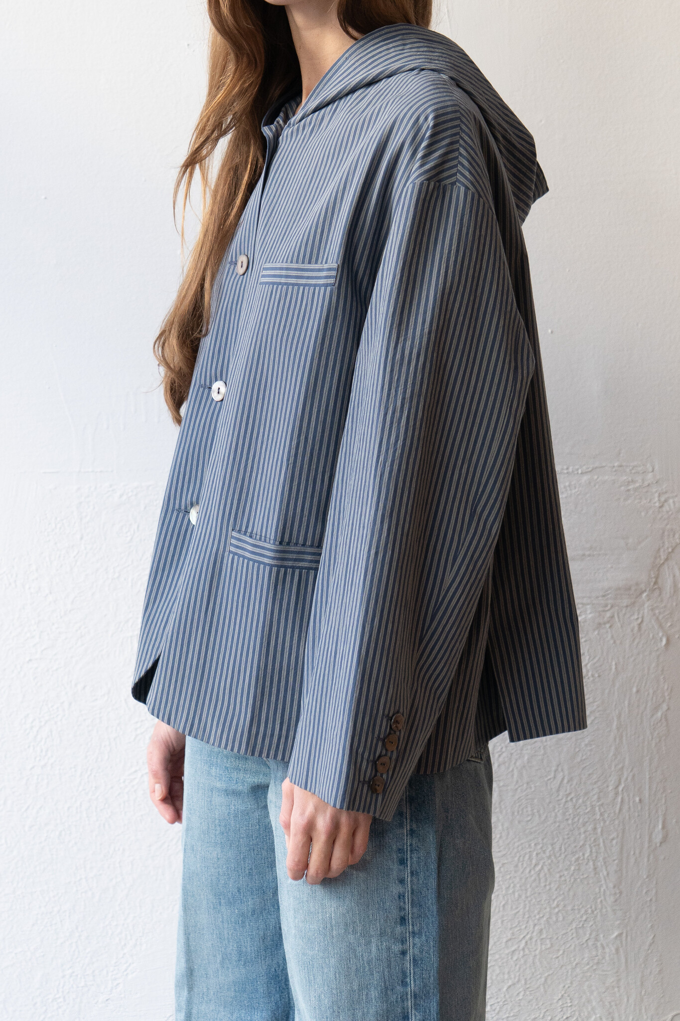 New for Cawley SS26, crafted from a Japanese washed typewriter cotton, the Reeva hooded shirt features a relaxed, roomy fit with a dropped shoulder that creates a comfortable, easy to wear silhouette. The shirt is designed with an enveloping hood and finished with a classic shell button closure. Three handy welt pockets and both function and clean refined detail.