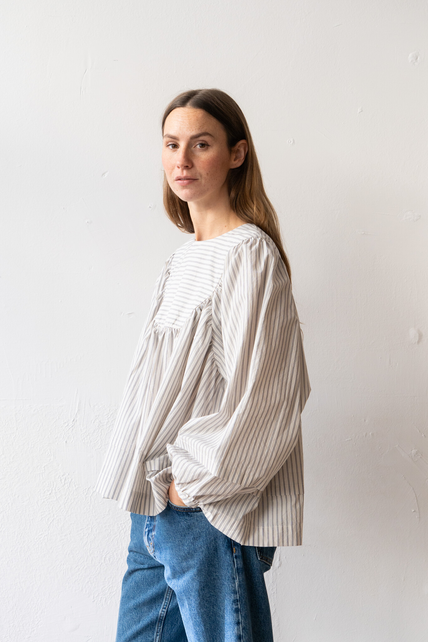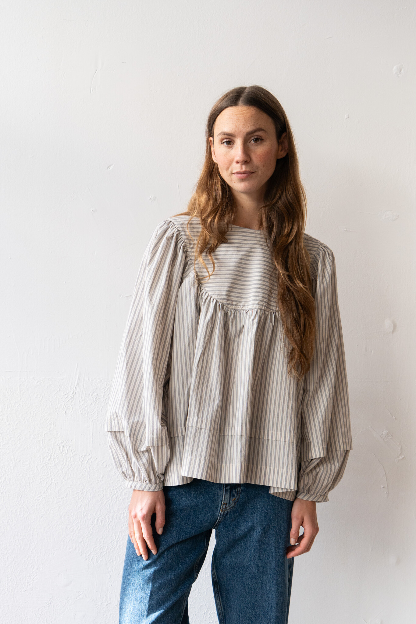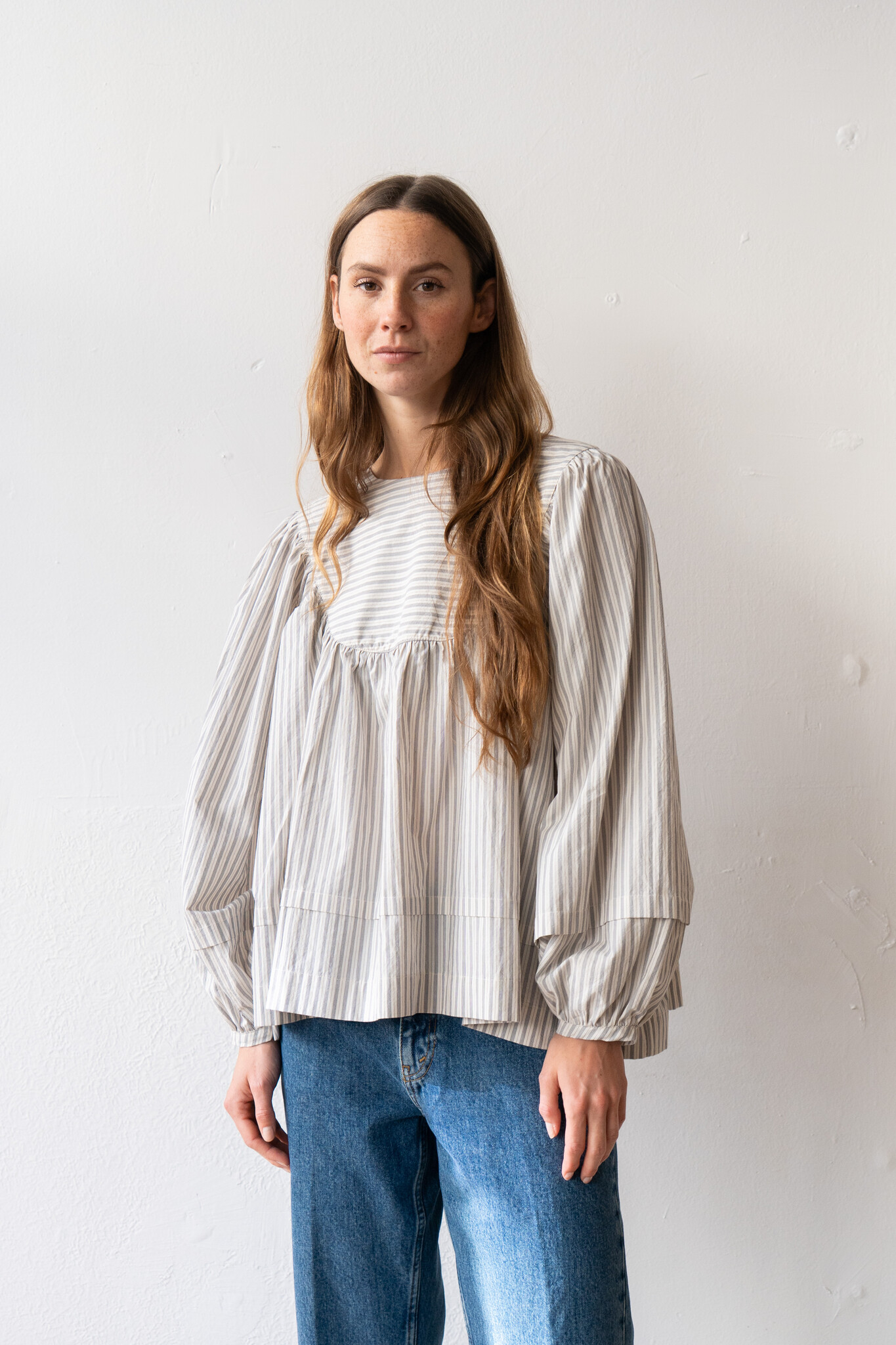 The Romy top by Cawley features a delicately gathered yoke and puff sleeve with pin tucks on both the hem and cuff. Crafted from a neutral striped Japanese typewriter cotton, the Romy is the perfect choice for spring and summer. The top can be worn either front or back, giving the wearer multiple styling options.