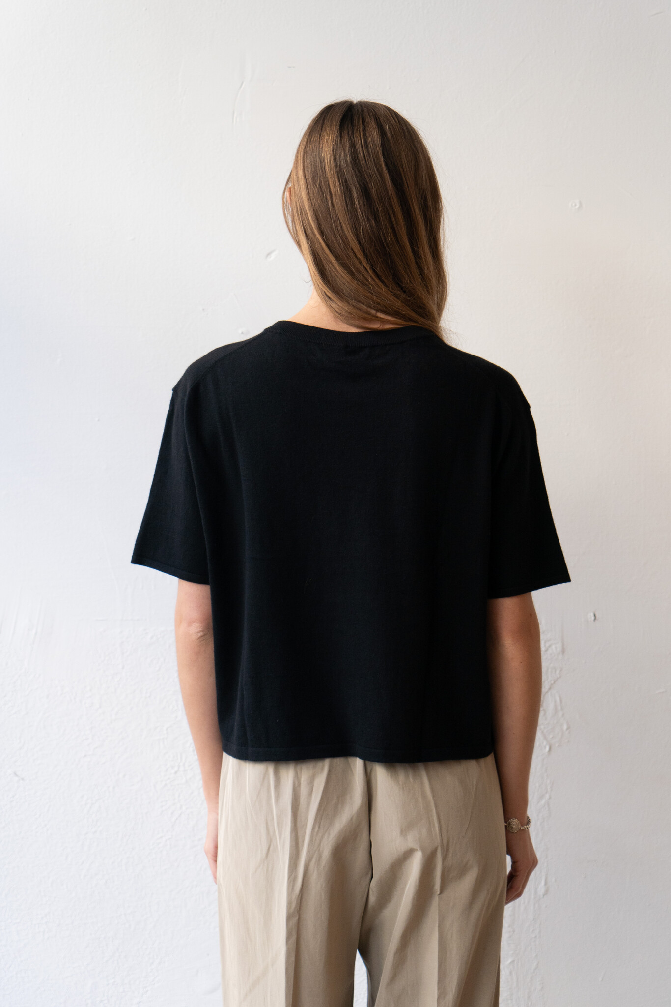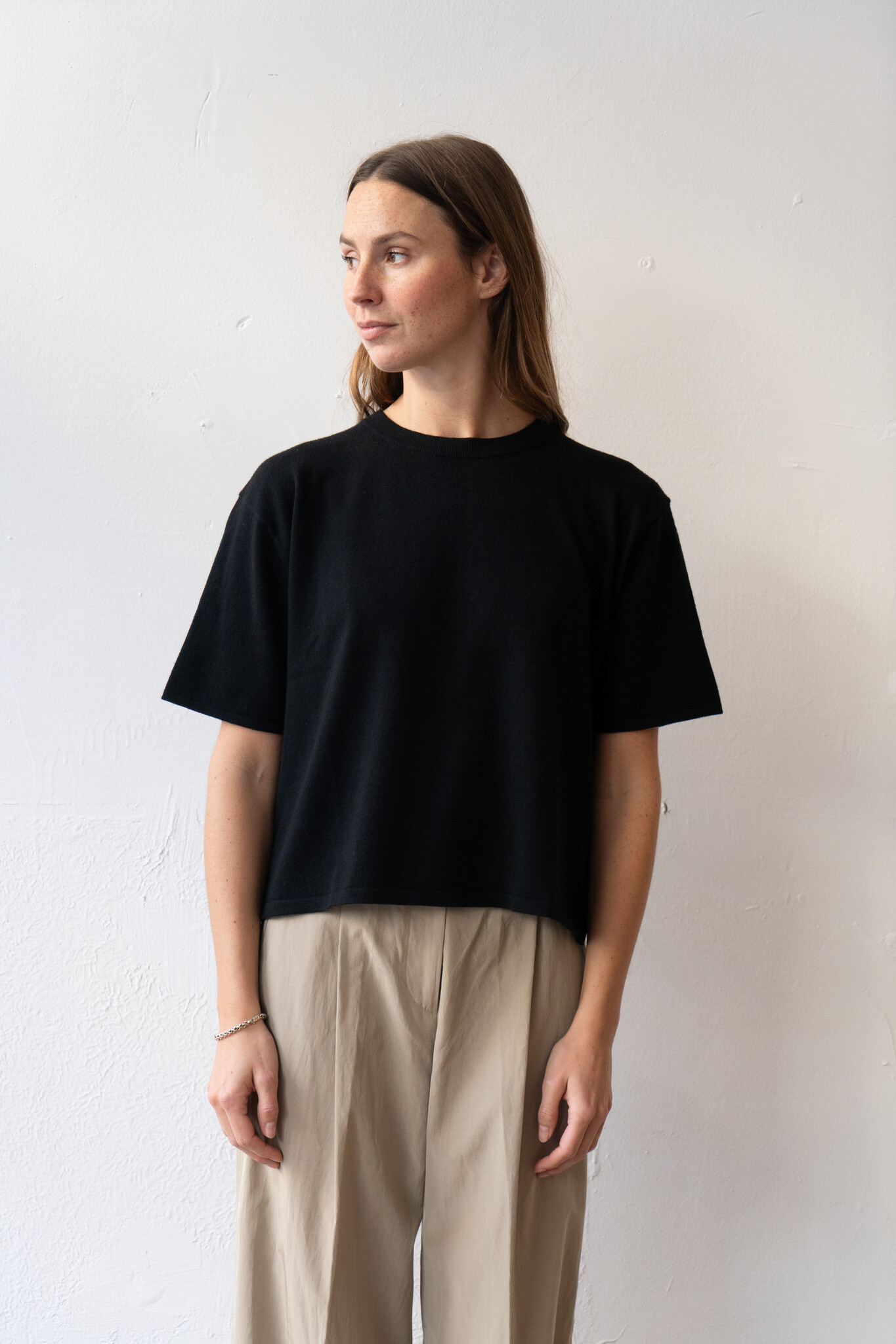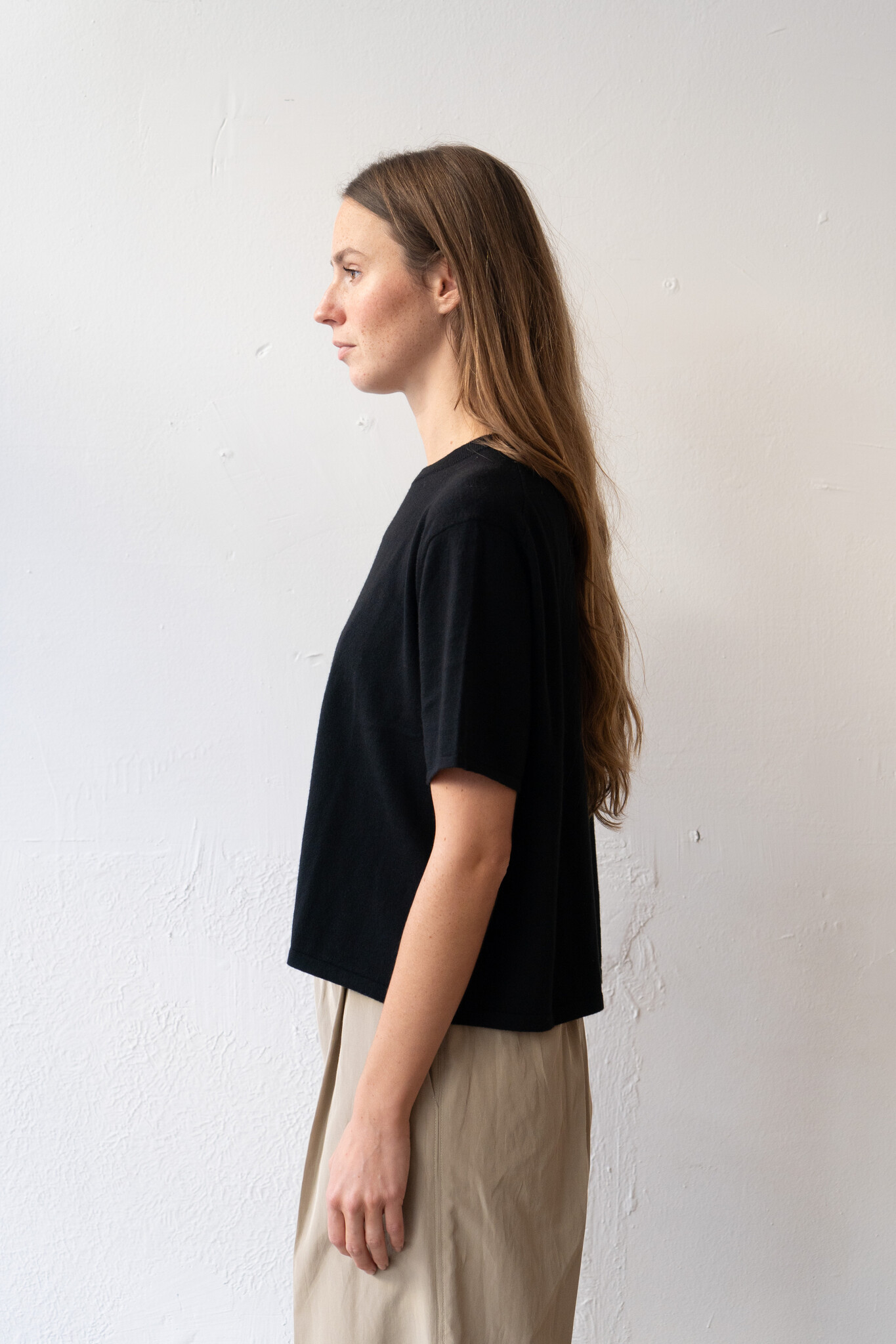A jersey-inspired piece, the Rubie T-shirt by Lisa Yang is crafted in our new composition combining the softness of cashmere and the breathability of cotton. The slightly wide and cropped silhouette is complete with a round neck and short sleeves.