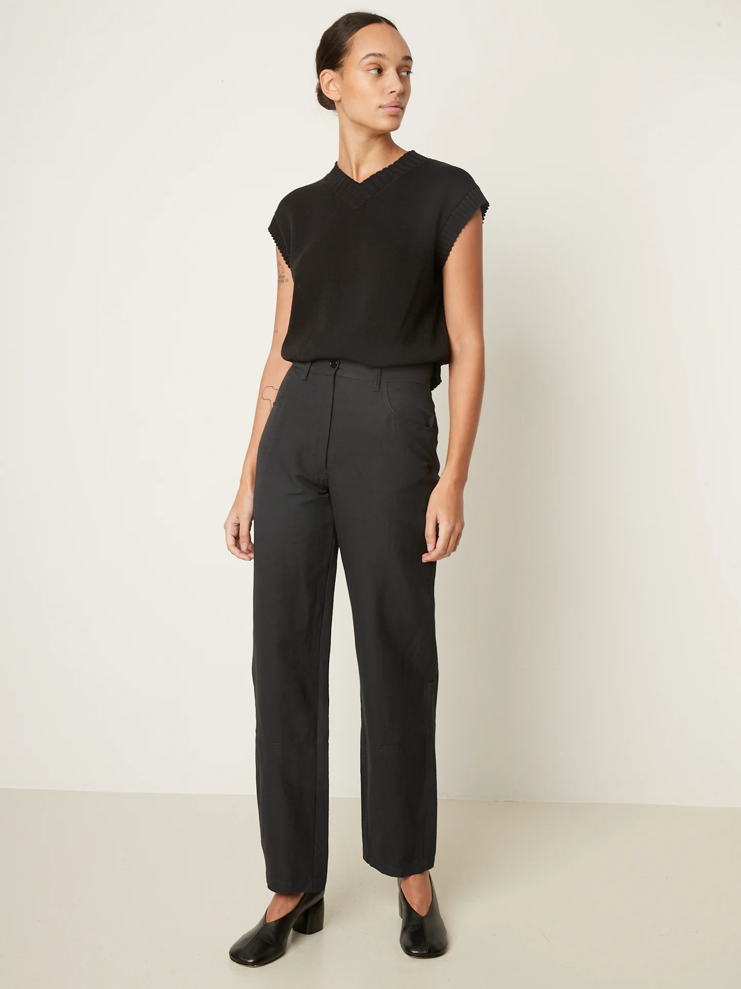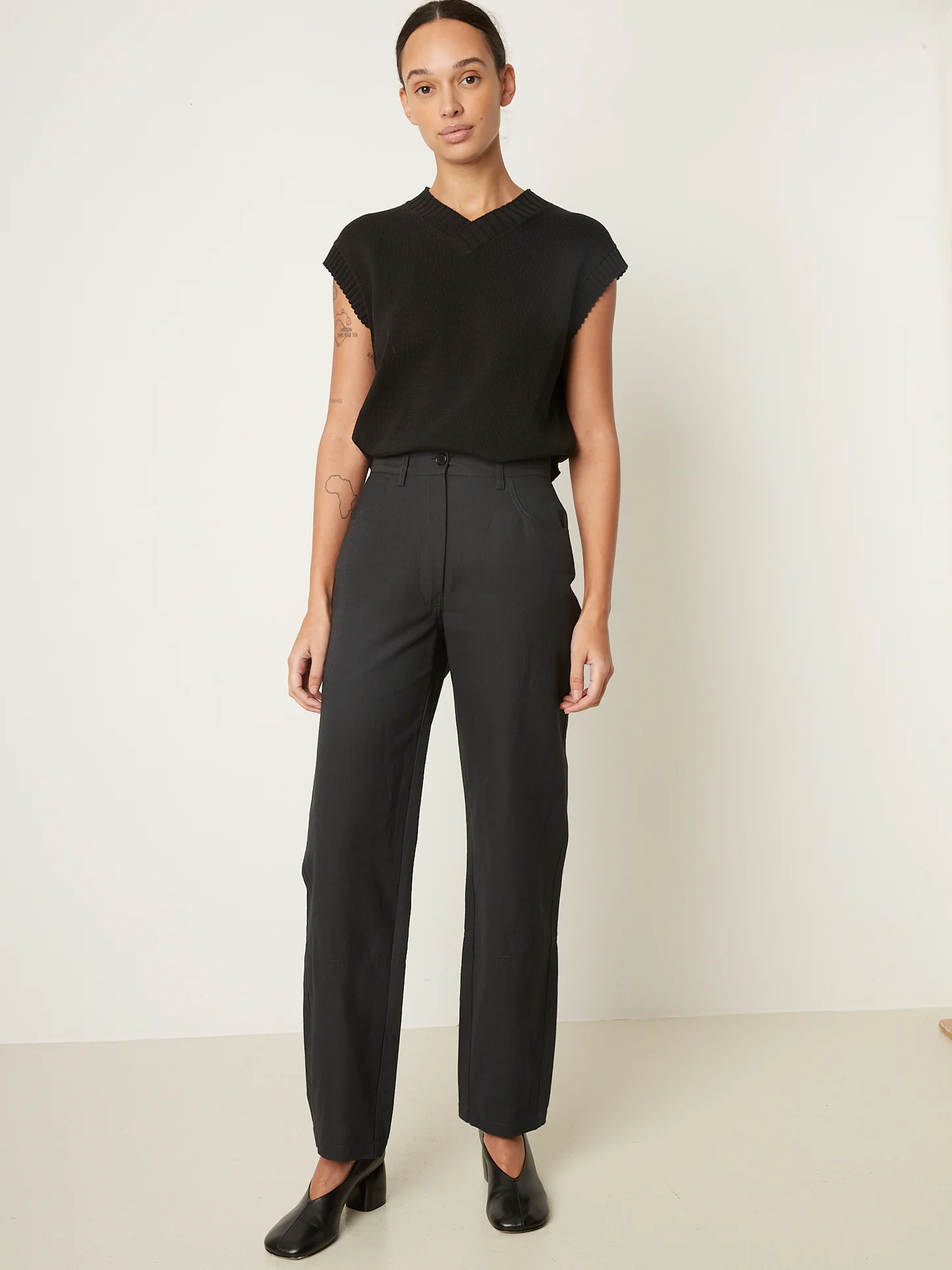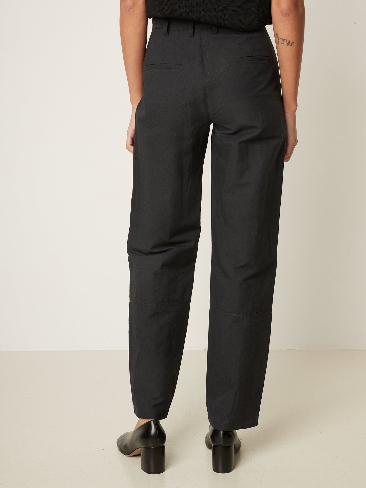 These Rue Blanche Seamo pants are made from a matt deep night blue linen blend with a discreet twill, offering a sense of purity and luxury. They feature a mid-rise waist, full-length tapered leg, belt loops, and a seam detail on the lower leg.