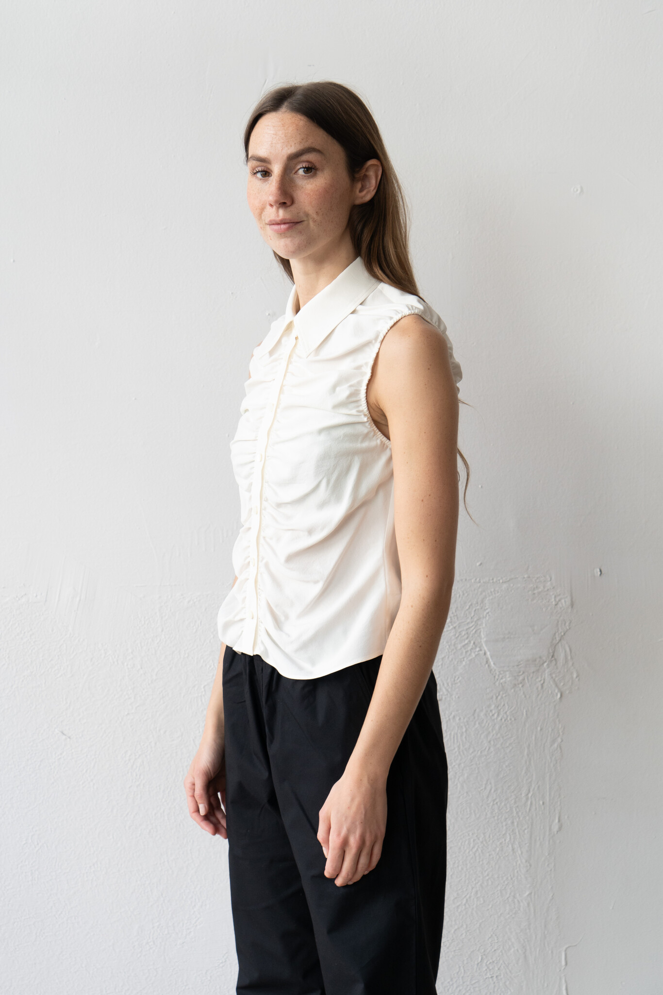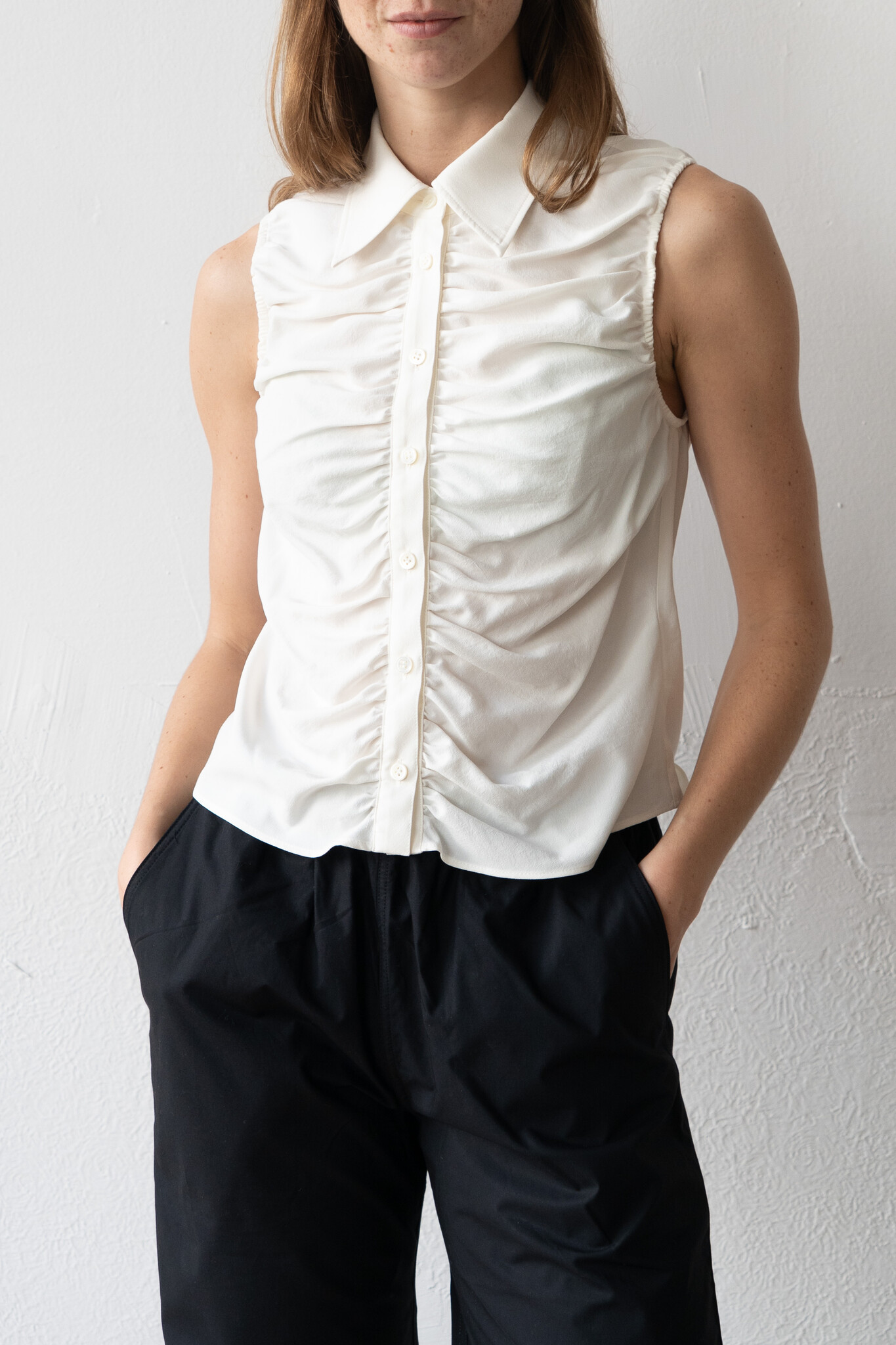 Silk Nidom Sleeveless Gather Shirt White by Ernie Palo.