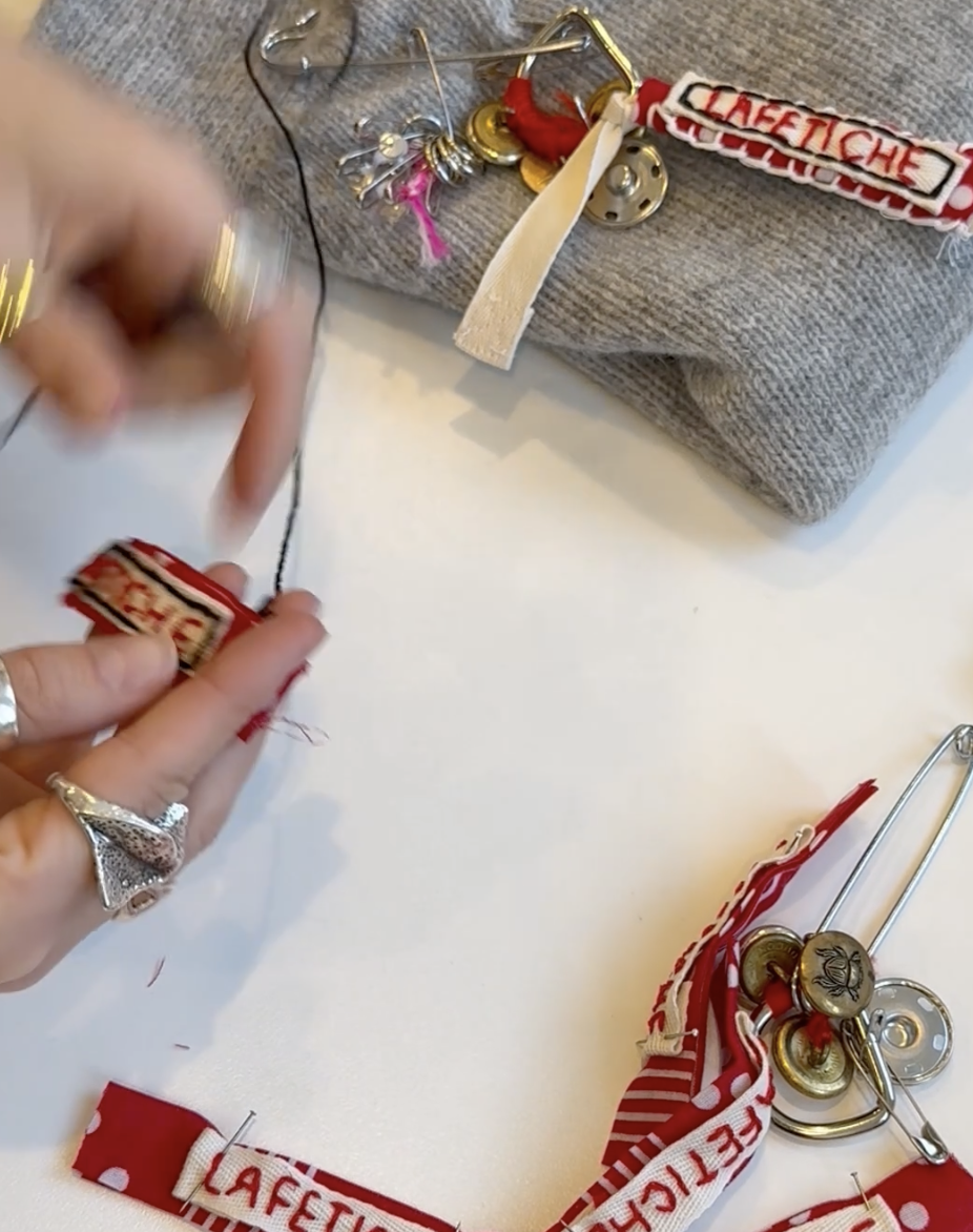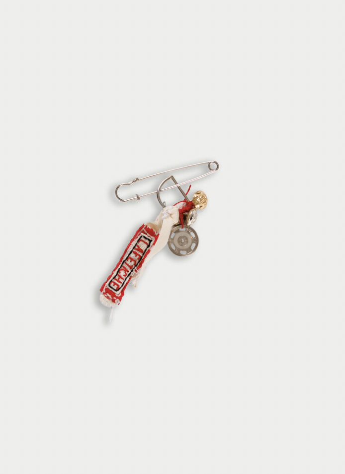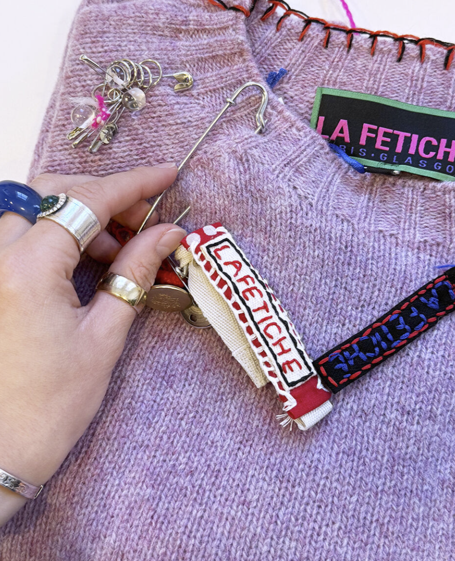 TATI pin version 1. Made by hand using surplus trimmings and hand-embroidery in La Fetiche's Glasgow Studio
