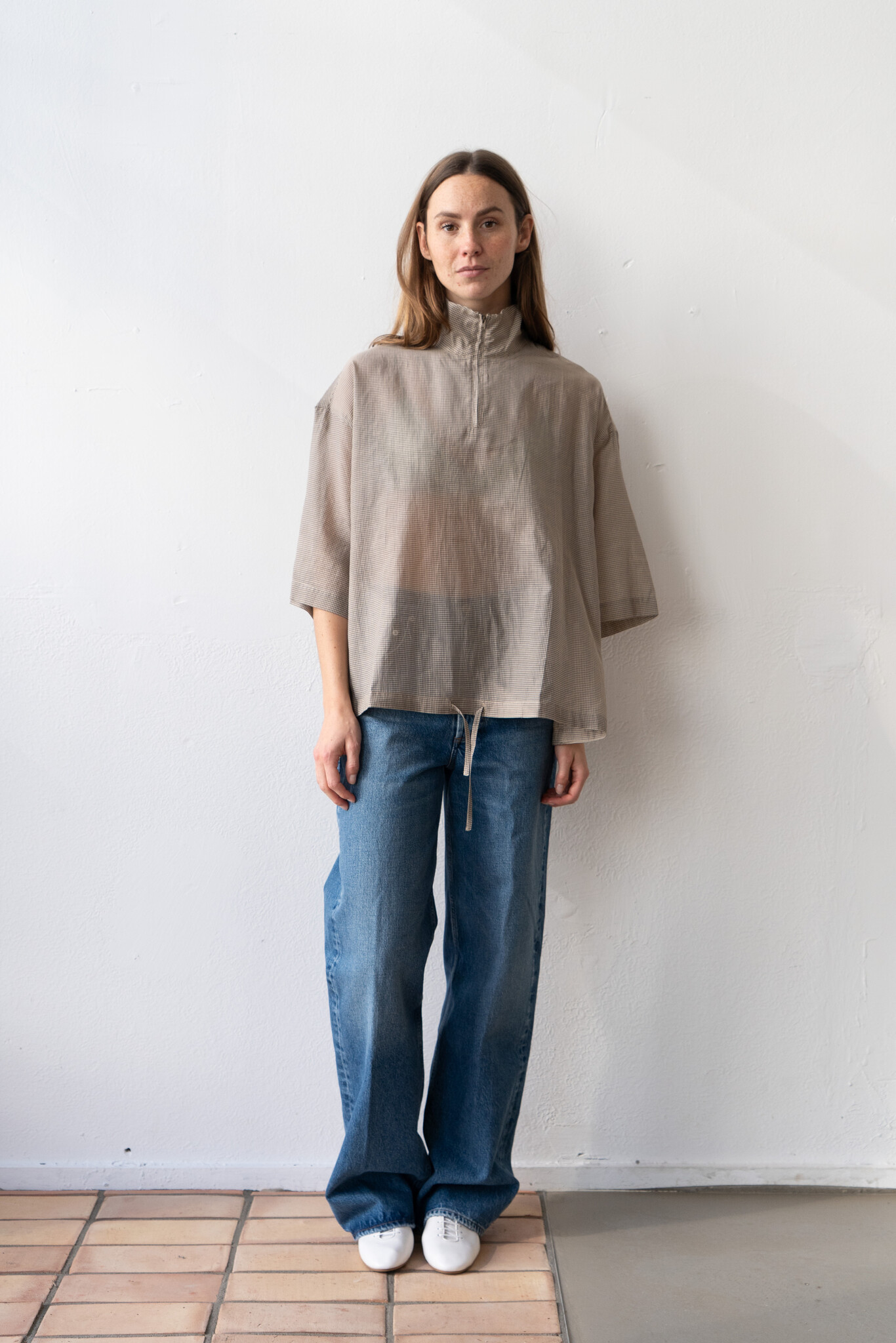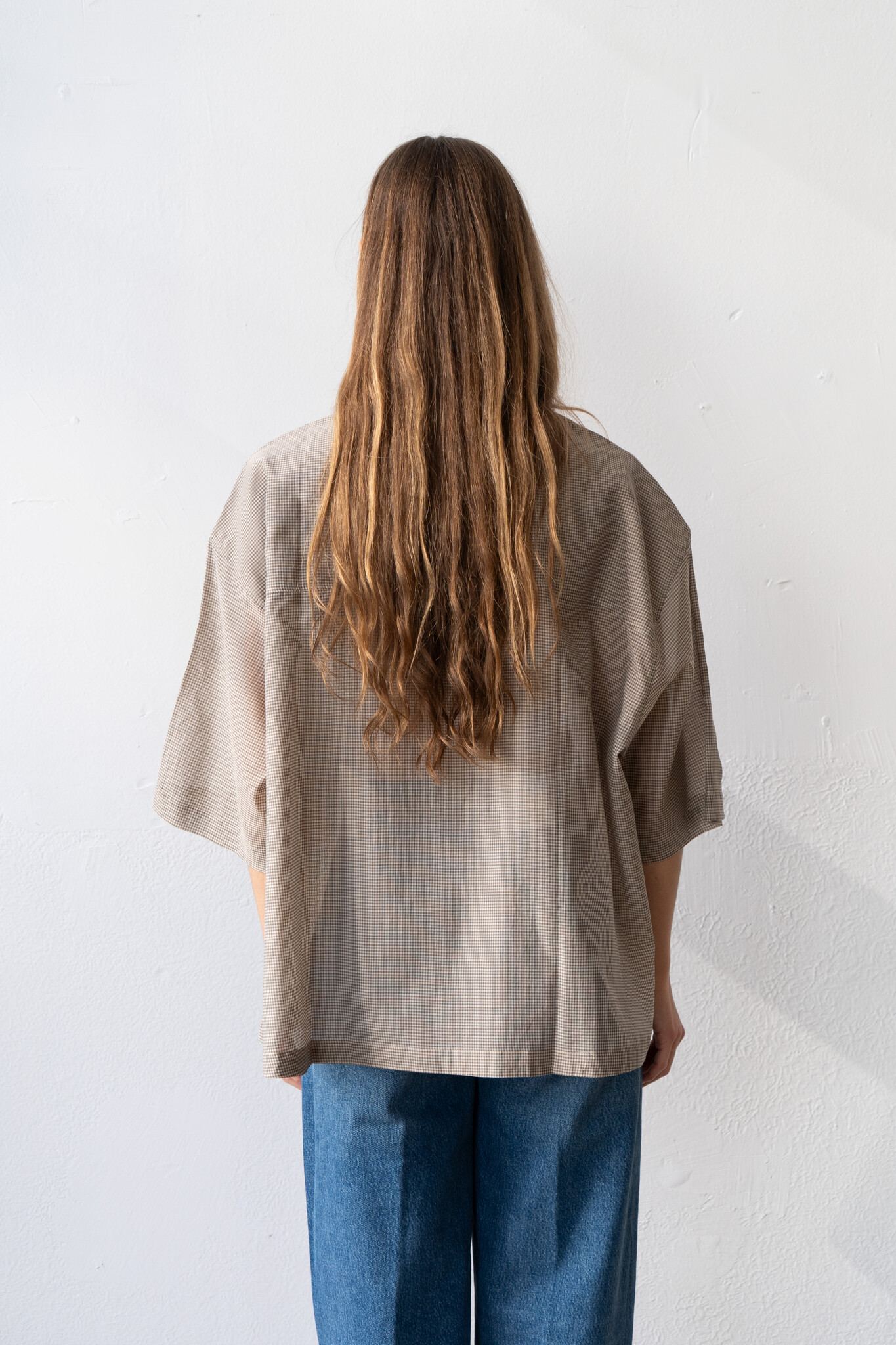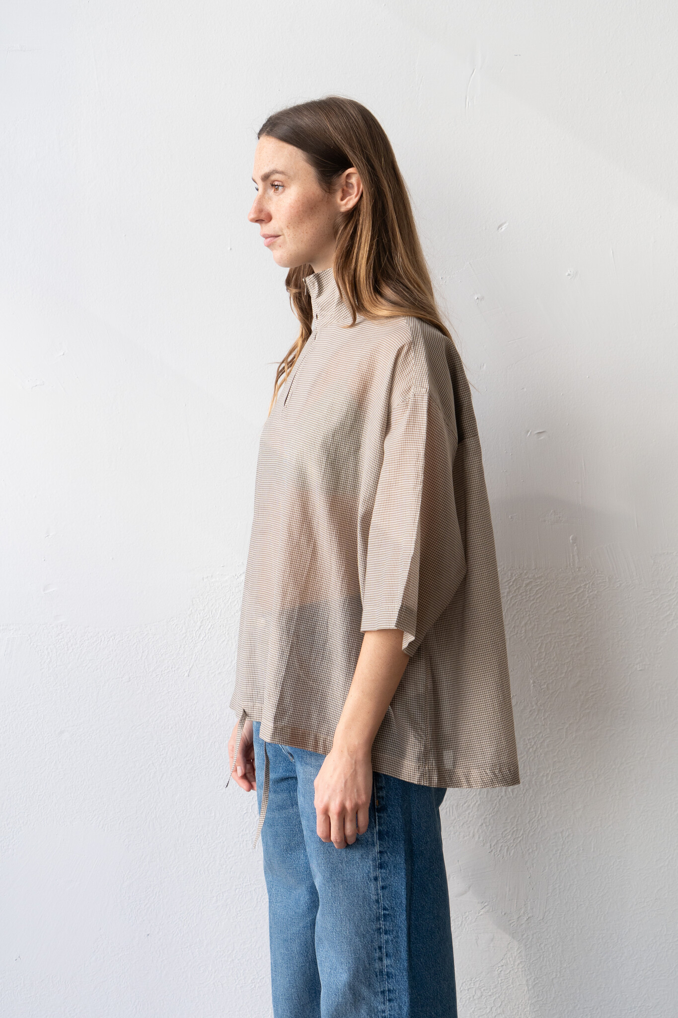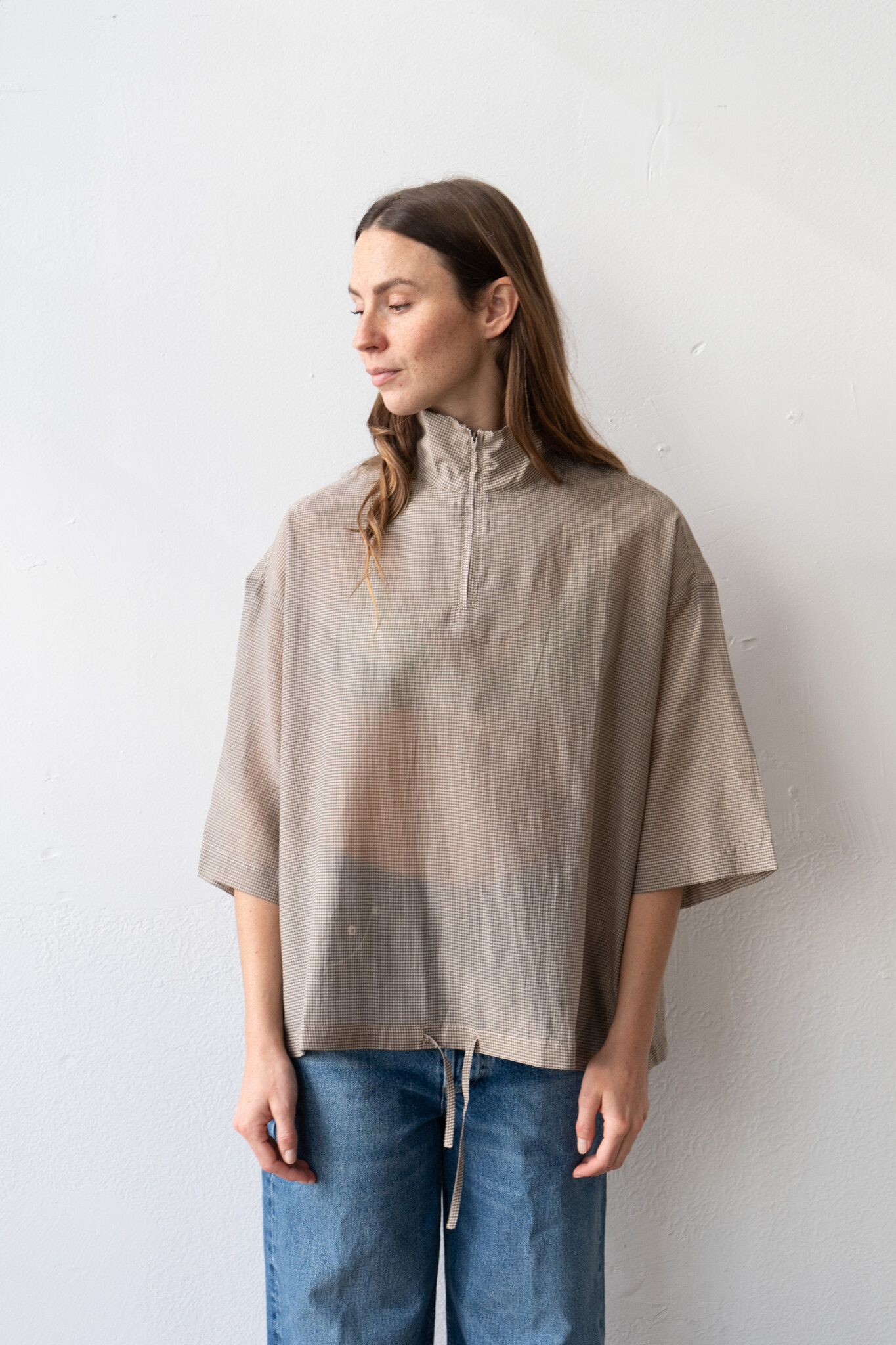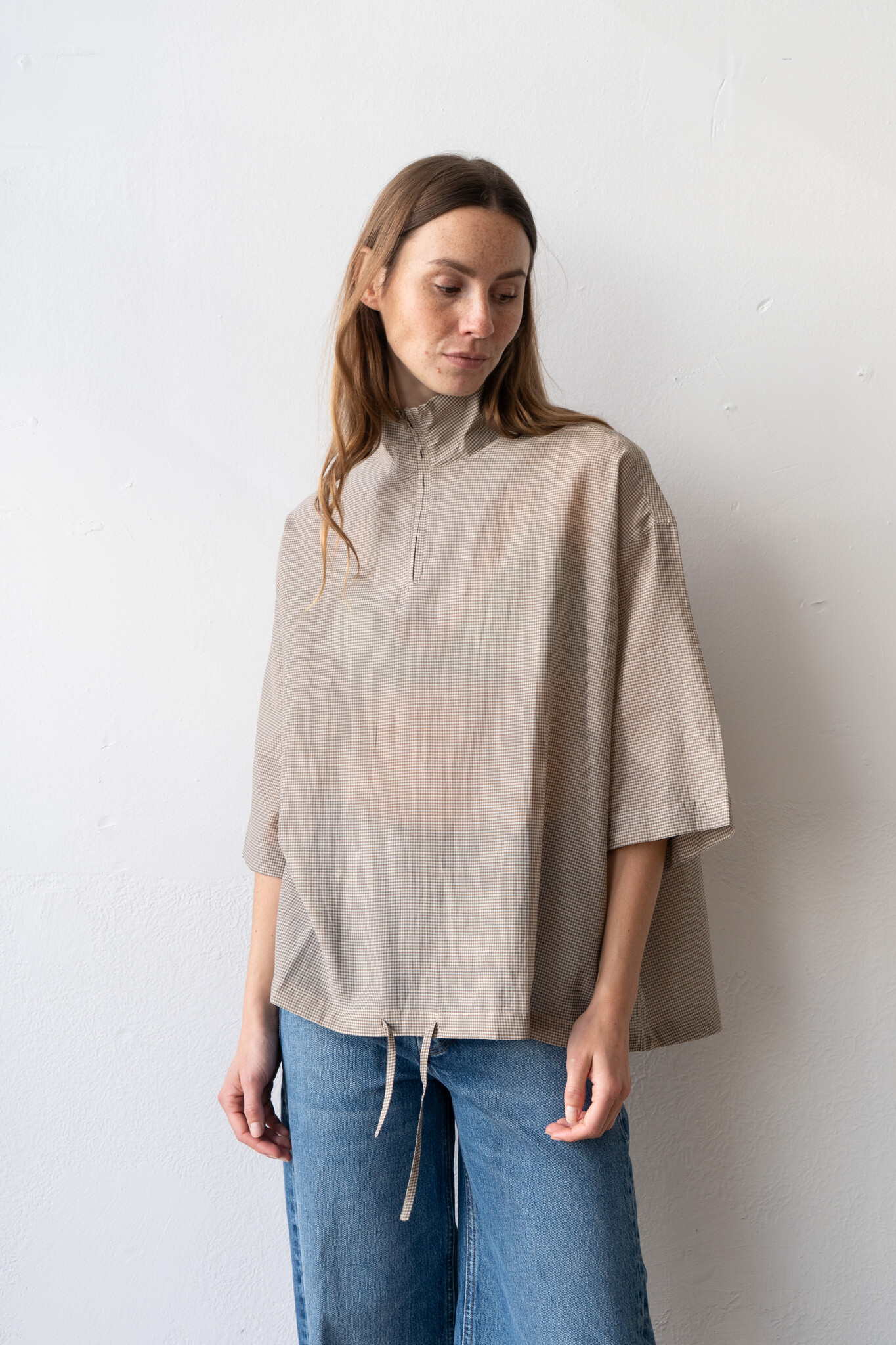 Short-sleeved shirt by Rus crafted from a lightweight silk-cotton fabric featuring a gingham motif. Features a relaxed, boxy silhouette with dropped shoulders and short, ample sleeves. Finished with a stand collar, half-zip closure, and an adjustable hem with ties.