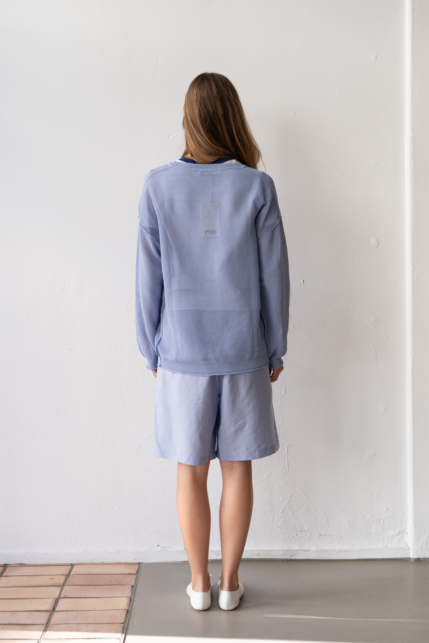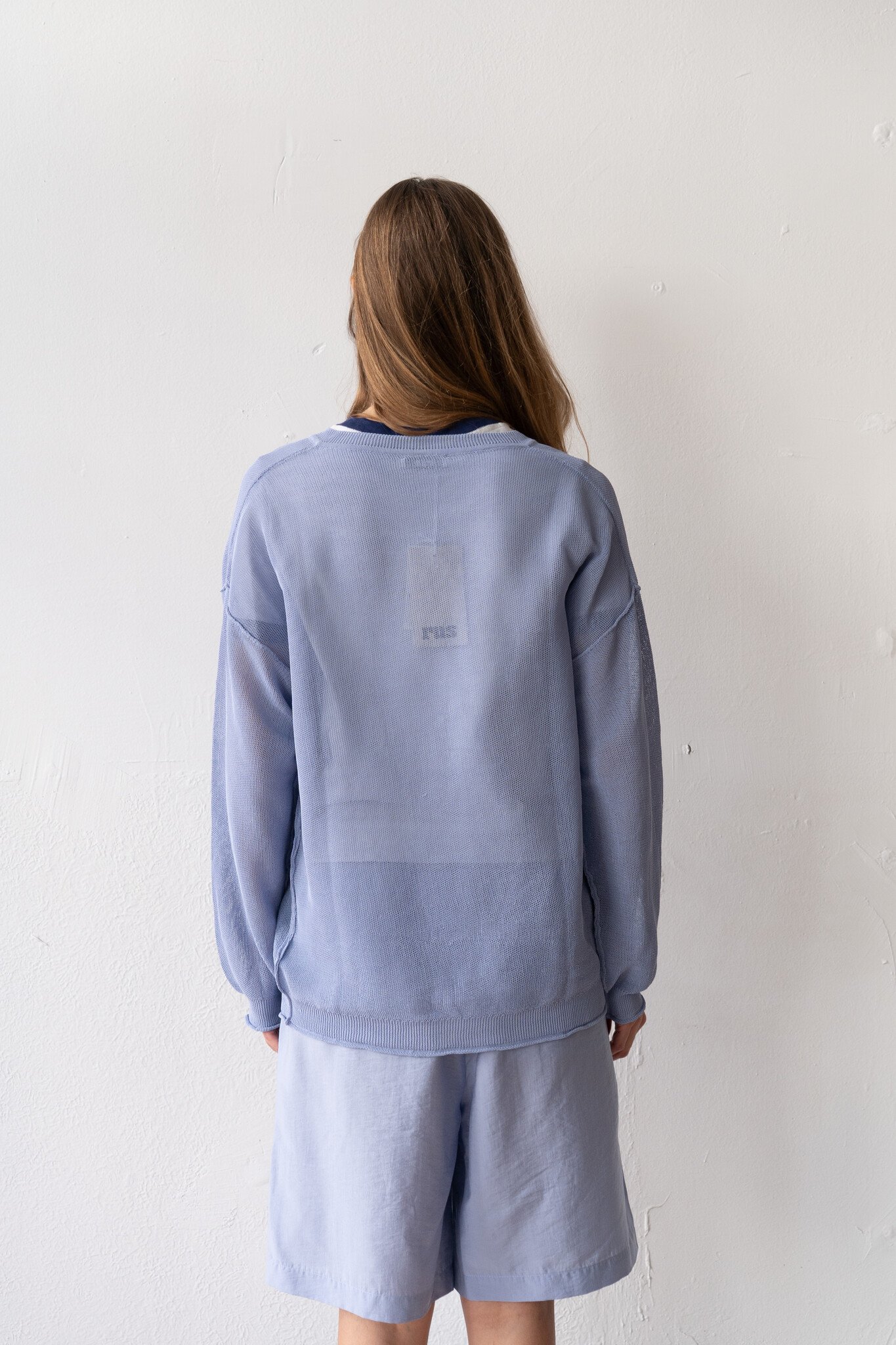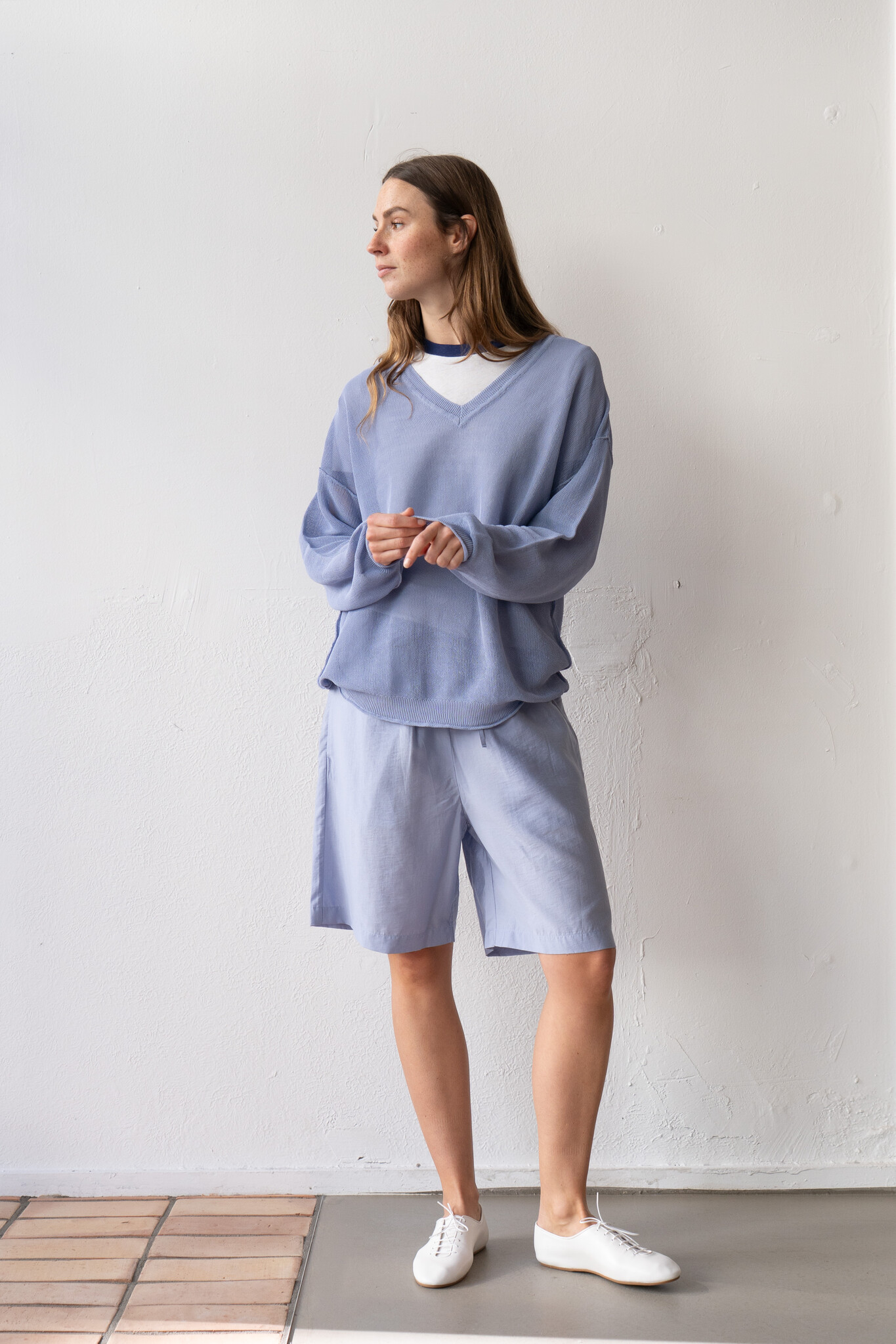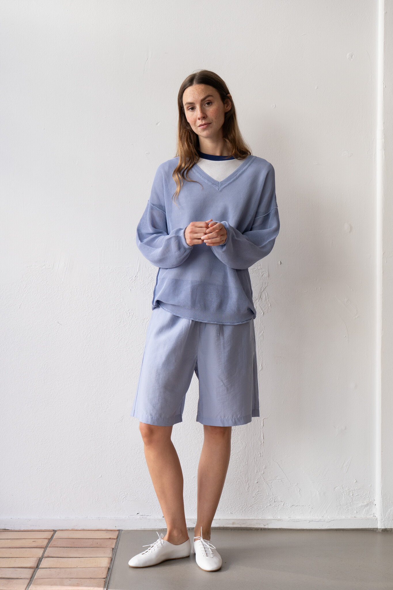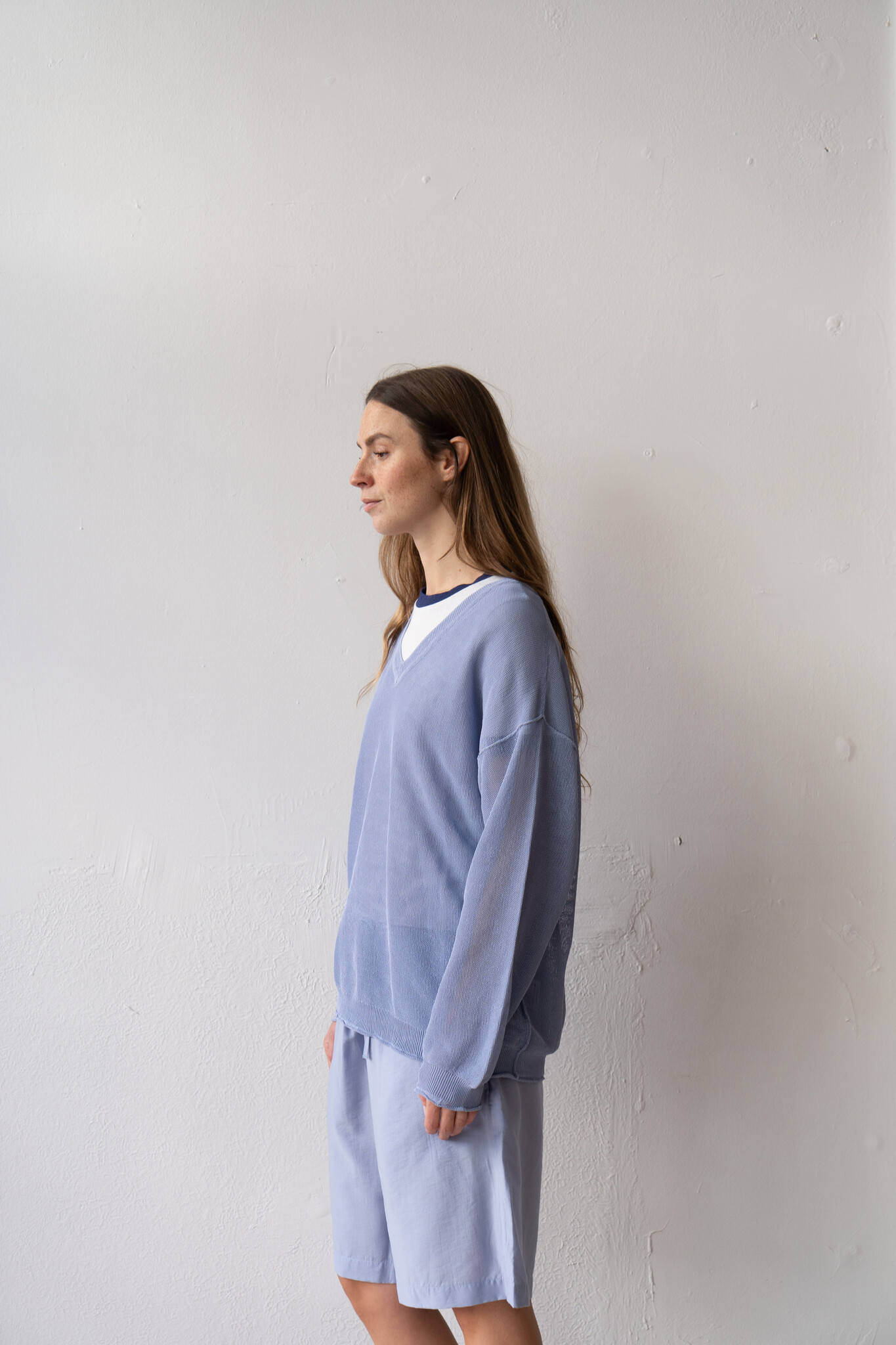 Boxy v-neck sweater by RUS crafted from a corded organic cotton yarn with a dry handfeel in a mesh texture. Featuring a relaxed silhouette with a deep ribbed v-neck and rolled ribbed trims.