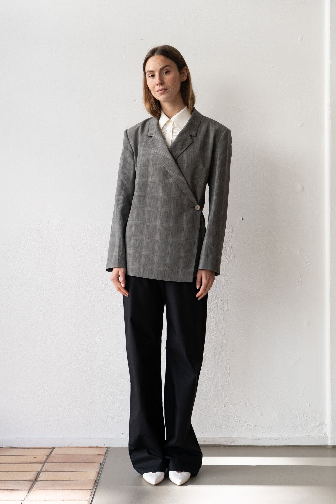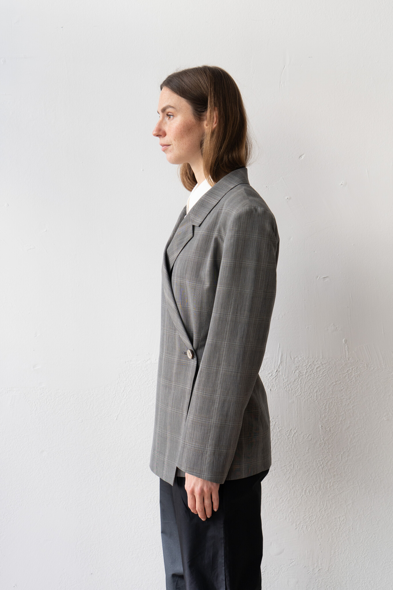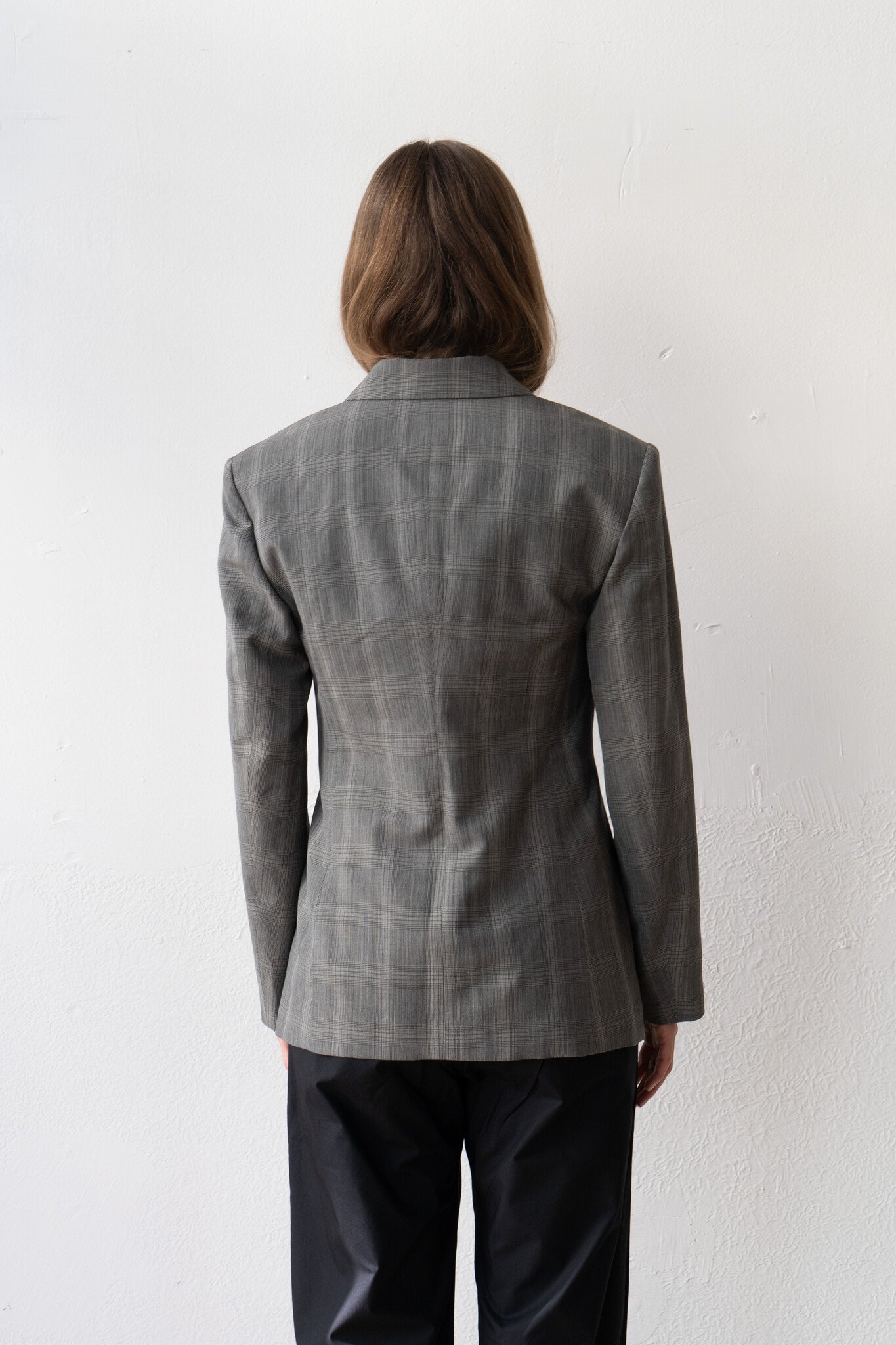 Ernie Palo tailored Wrap Jacket Grey Check in a beautiful Japanese wool, silk, cashmere blend.
